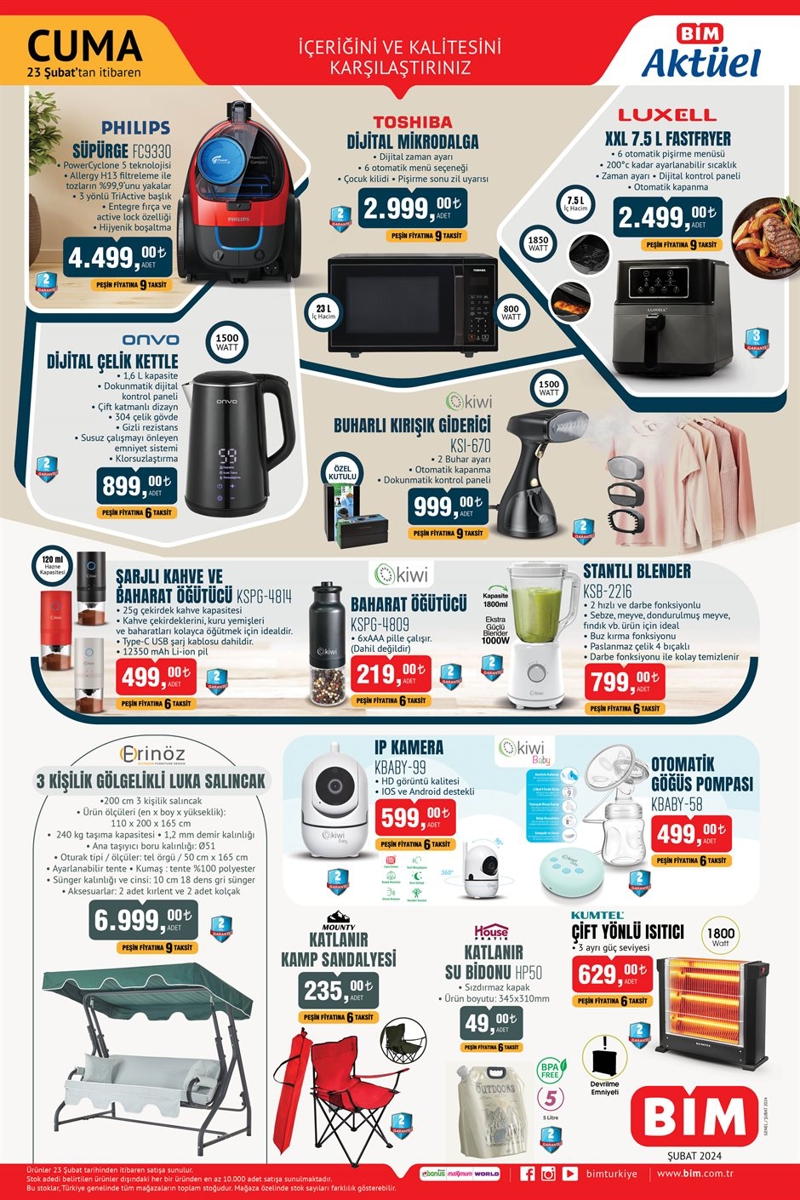 BİM'in 23 Şubat 2024 tarihli aktüel ürünler kataloğu yayınlandı. BİM'de bu cuma Teknoloji, Tekstil, Elektrikli Ev Aletleri, Lisanslı oyuncaklar, Züccaciye ve Mutfak, Çok amaçlı eşyalar ve kışlık giyim ürünleri grubunda çok sayıda fırsat ürünü geliyor. Peki bu Cuma BİM'de neler var? Cuma günü için hazırlanan BİM aktüel kataloğunda bu hafta; Philips Süpürge 4.499 TL ve HP7N4W2AA Notebook 10.999 TL fiyatıyla öne çıkıyor. İşte BİM aktüel ürünler kataloğu