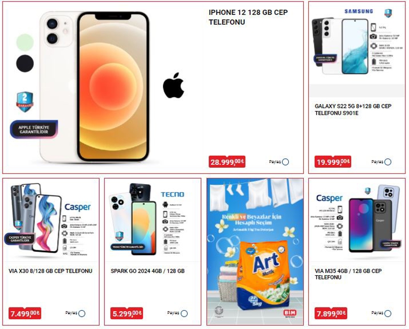 BİM aktüel ürünleri her hafta kısıtlı stoklarla satışa sunuluyor. Beklediği ürünleri kaçırmak istemeyenler günler öncesinden katalog araştırmalarına başlıyor. Peki, BİM 19 Temmuz aktüel ürünler kataloğunda neler var? Bu cuma BİM'de iPhone 12 Cep Telefonu 28.999 TL, Samsung Galaxy S22 Cep Telefonu 19.999 TL, Casper VIA X30 Cep Telefonu 7.499 TL fiyatla satışa sunulacak. İşte kataloğun tamamı...