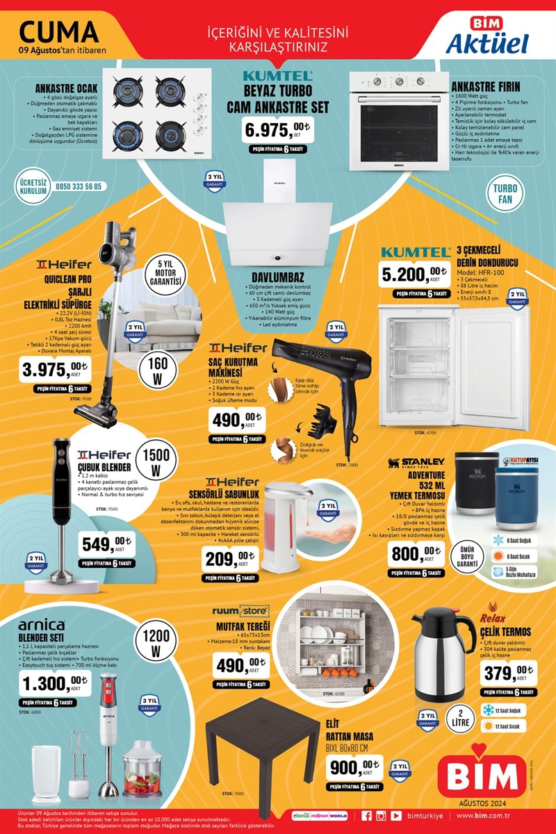 BİM'in bu hafta cuma kampanyası için hazırlanan aktüel ürünler belli oldu. BİM'e bu hafta Ankastre Set, çantalı hurç çeşitleri, saç kurutma makinesi, yemek termosu, 3 Çekmeceli Derin Dondurucu ve Kalın Tekerlekli Katlanabilir Elektrikli Bisiklet gibi fırsat ürünleri yer alıyor. Peki BİM'de bu hafta başka neler var? İşte BİM 9 Ağustos 2024 aktüel ürünler kataloğu