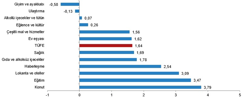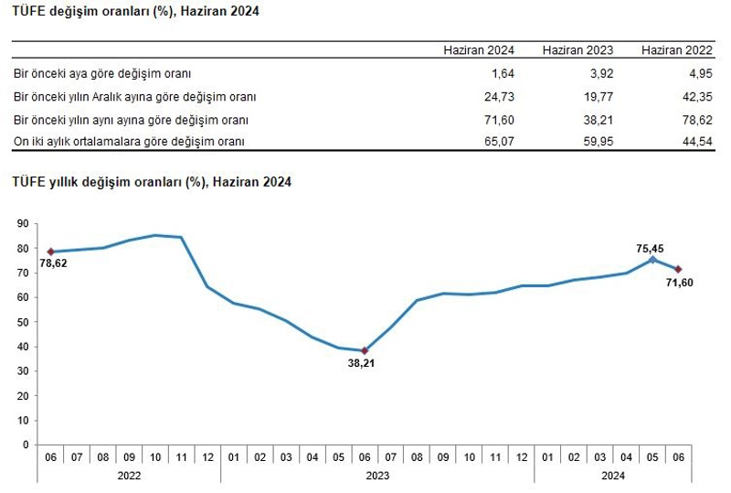 Aylık bazda TÜFE yüzde 1,64, Yİ-ÜFE yüzde 1,38 artış gösterdi.TÜFE, haziranda geçen yılın aralık ayına göre yüzde 24,73, geçen yılın aynı ayına kıyasla yüzde 71,6 oldu.