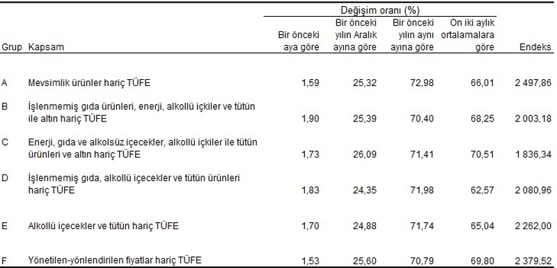 Ana sanayi gruplarının aylık değişimlerine bakıldığında ise ara malında yüzde 0,71, dayanıklı tüketim mallarında yüzde 1,57, dayanıksız tüketim mallarında yüzde 1,95, enerjide yüzde 2,22 ve sermaye mallarında yüzde 1,53 artış görüldü.Özel kapsamlı TÜFE göstergeleri ve değişim oranları (%), Haziran 2024