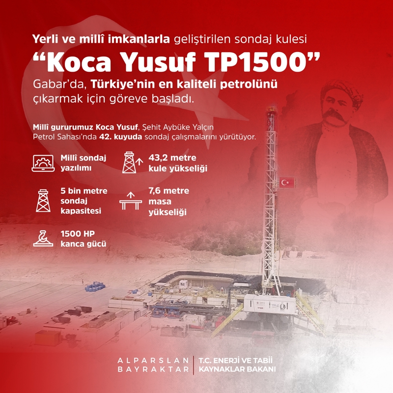 Enerji ve Tabii Kaynaklar Bakanlığından yapılan açıklamaya göre, 5 bin metre sondaj kapasitesine sahip Koca Yusuf, Gabar'da Türkiye'nin en kaliteli petrolünü bulmak için göreve başladı.