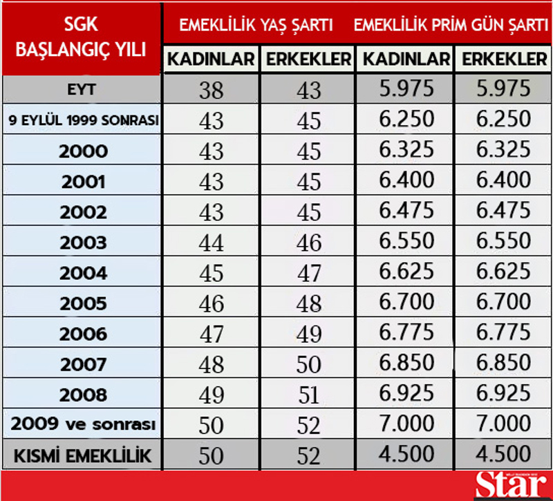 2000 yılında sigorta girişi yapan bir kişi, 44 yaşında emekli olabilecekken, 2008 yılında işe başlayanlar için yaşı 51'e kadar çıkacak. Bu durum, SGK prim gün sayısı ile doğrudan ilişkilendirilecek.