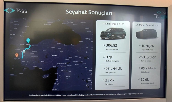 Beşiktaş'ta bulunan bir AVM'de, geçtiğimiz çarşamba günü TOGG Deneyim Merkezi açıldı. Merkez ilk günden itibaren yoğun ilgi görüyor. Deneyim merkezinde TOGG C-SUV'un Gemlik Mavisi rengi sergilendi. AVM'ye gelenler TOGG marka aracı dışarıdan inceledi, deneyim merkezinden bulunan ön panel deneyim stantlarında aracın içindeki panellerle ilgili bilgi aldılar. Kurulan deneyim merkezinde TOGG'un menzili ile bilgilendirme de yapıldı. Merkezdeki bilgilendirmeye göre TOGG marka C-SUV, 306 lira 82 kuruş maliyet ile İzmir'e giderken, 1.6 motorlu bir C-SUV'la ise 1020 lira 74 kuruşa İzmir'e seyahat edilebileceği hesaplandı. İlk şubesi İstanbul'da açılan TOGG Deneyim Merkezi'nin Türkiye genelinde 20'ye çıkarılması bekleniyor.