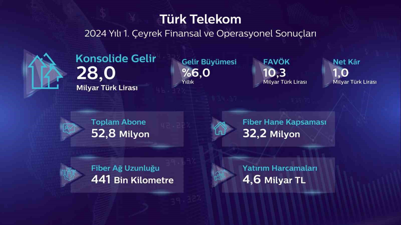Türk Telekom, 2024 yılı birinci çeyrek finansal ve operasyonel sonuçlarını açıkladı. Türk Telekom'un konsolide gelirleri yıllık bazda yüzde 6 artarak 28 milyar TL'ye ulaştı. FAVÖK'ü (Faiz, amortisman ve vergi öncesi kâr), yüzde 23 artarak 10,3 milyar TL olan Türk Telekom'un, FAVÖK marjı ise geçen yıla kıyasla 510 baz puan iyileşerek yüzde 36,6'ya yükseldi. Türk Telekom'un ilk çeyrekteki net kârı 1 milyar TL oldu. Türk Telekom, 2024'ün ilk çeyreğinde 4,6 milyar TL yatırım gerçekleştirdi.