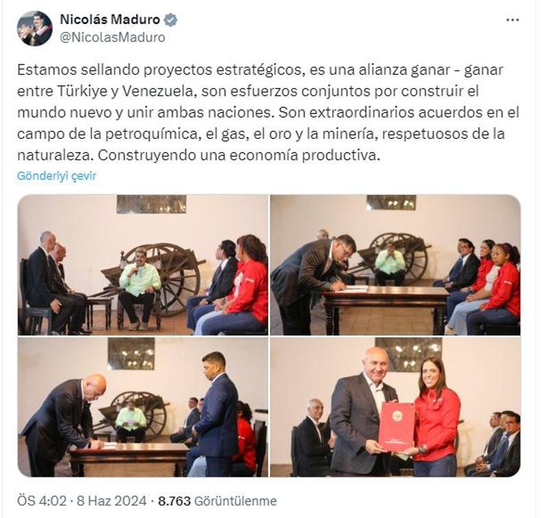 Maduro paylaşımında, "Stratejik projeler imzalıyoruz, Türkiye ile Venezuela arasında kazan-kazan ittifakı var, yenidünyayı inşa etme, iki milleti birleştirme yönünde ortak çabalar bunlar. Bu anlaşmalar petrokimya, gaz, altın ve madencilik alanında doğaya saygılı, olağanüstü anlaşmalardır. Amacımız üretken bir ekonomi inşa etmek." dedi.