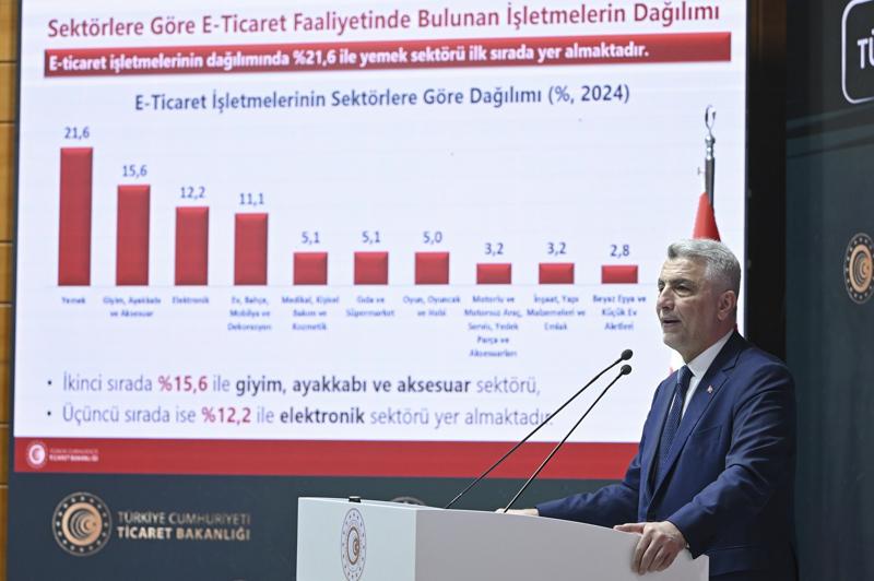 Geçen yıl e-ticarette öne çıkan sektörlere ilişkin de bilgi veren Bolat, "Geçen yıl en yüksek oran yüzde 21,6 ile yemek sektörüne ait. Bu sektörü yüzde 15,6 ile giyim, ayakkabı ve aksesuar, yüzde 12,2 ile elektronik takip etti. Dördüncü sırada ev, bahçe, mobilya, dekorasyon ürünleri, beşinci sırada da medikal, kozmetik ve kişisel bakım ürünleri geldi. e-Ticaret, gıda ve süpermarket sektörünün de yüzde 5'ine ulaşmış durumda. Bu çeşitlilik rekabeti artırmakta, tüketiciye de daha fazla tercih imkanı sunmaktadır." dedi.