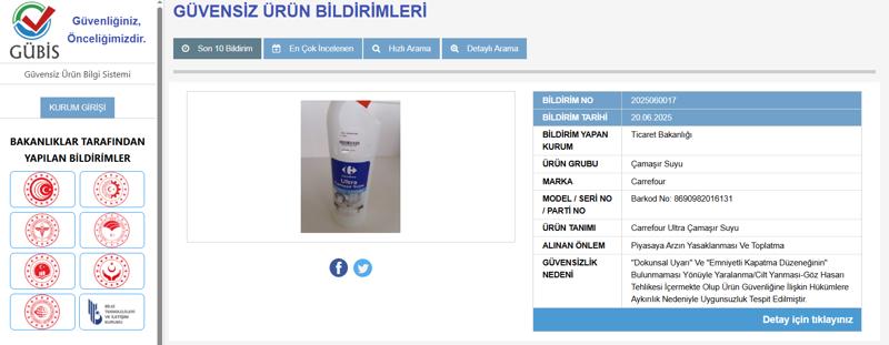 Güvensiz Ürün Bilgi Sistemine eklenen Carrefour markalı çamaşır suyunun toplatılması kararına ilişkin ise şu bilgilere yer verildi: