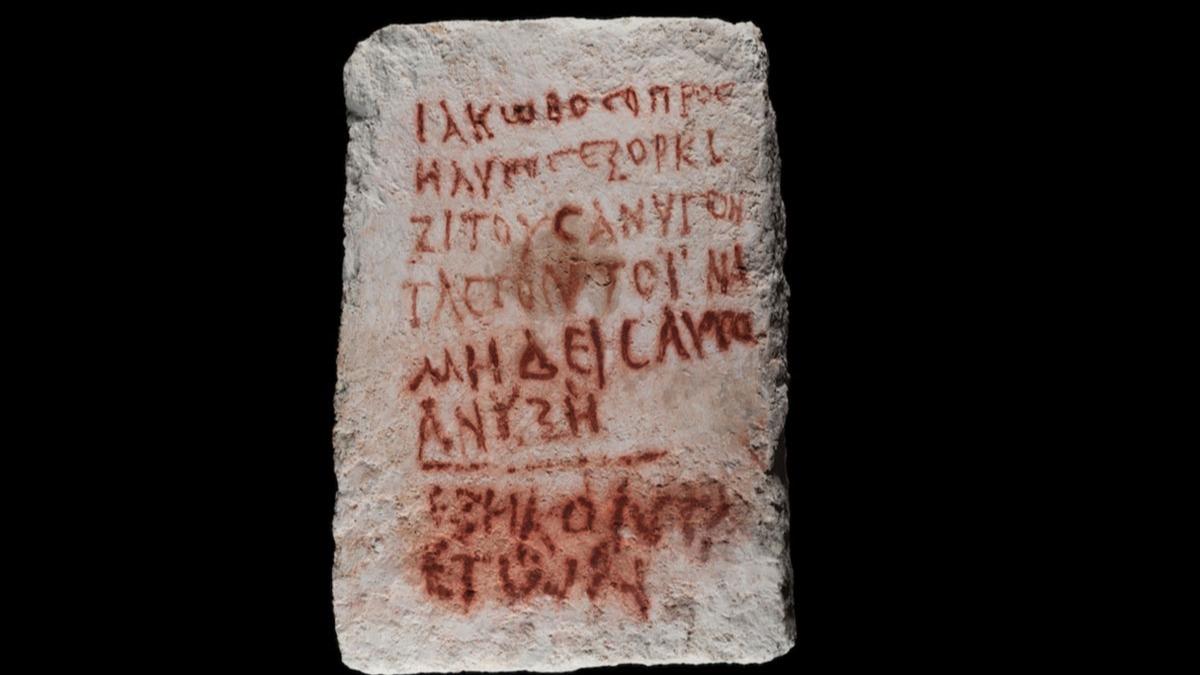 Uzmanlar, yaklaşık 1.800 yıllık mezar taşında, mezar soyguncularını caydırmak için tasarlanmış bir altıgen ve kırmızı boyayla düzensiz Yunanca yazıyla karalanmış ifadeler yer aldığını belirtti.