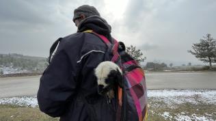 Kar altında doğan kuzuları üşümemeleri için azık çantasında taşıyor