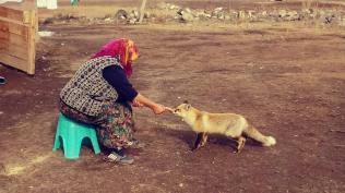 Evinin bahçesine kadar gelen tilkiyi elleriyle besledi