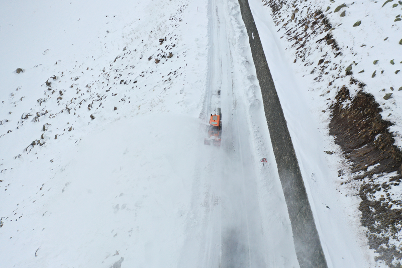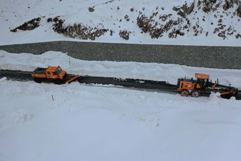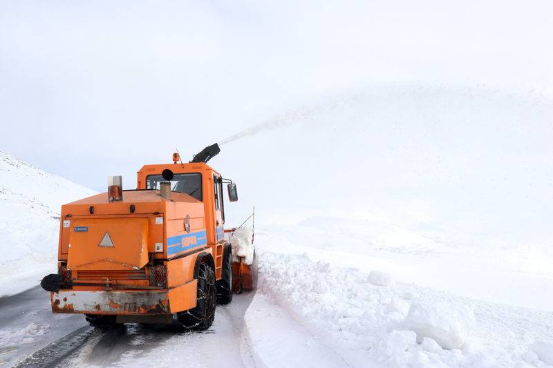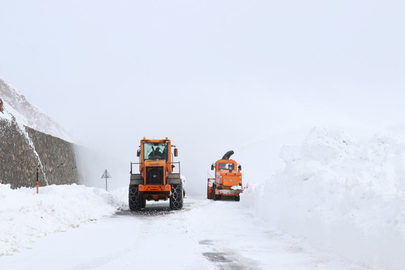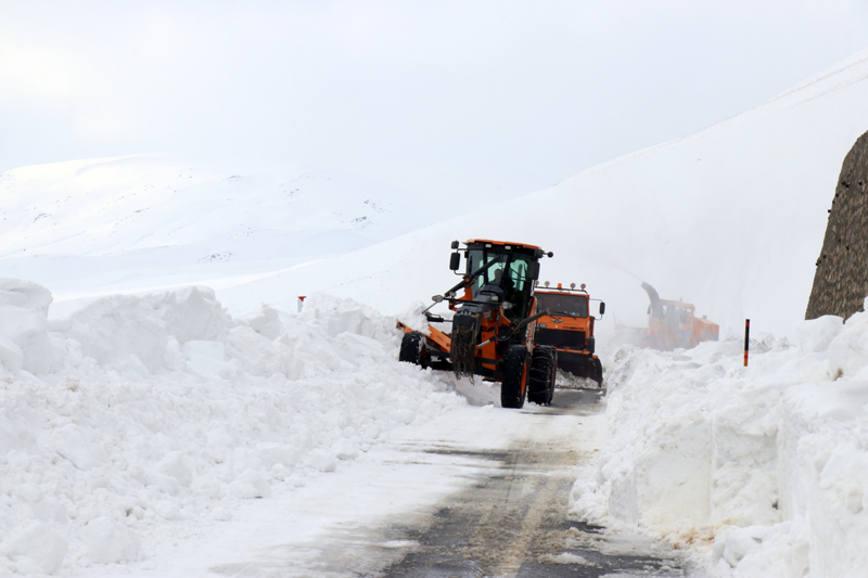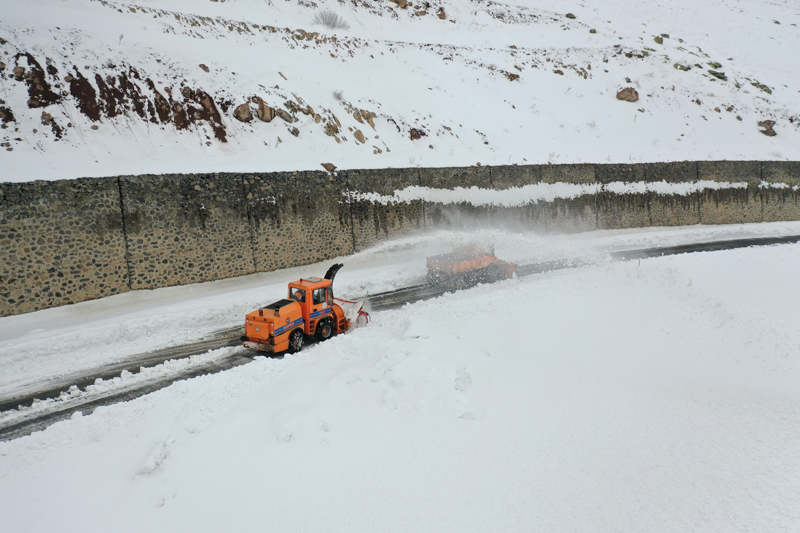 Kar ve tipi nedeniyle sürekli kapanan kara yolunda rotatif, greyder, kepçe ve yükleyici ile yol açma ve genişletme çalışması yapan ekipler, ulaşımın kesintisiz sağlanması için gece gündüz mesai yapıyor.