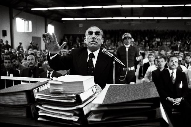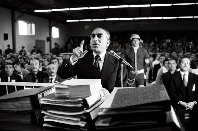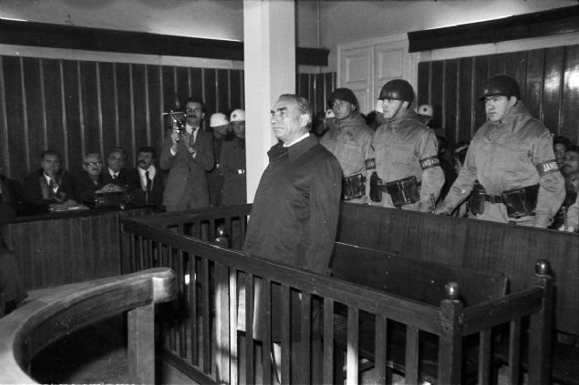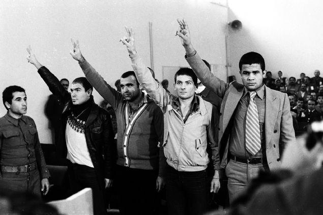 Laikliği aykırı davranmak suçundan haklarında 2 - 36 yıl arasında hapis cezası istenen Milliyetçi Selamet Partisi (MSP) Genel Başkanı Necmettin Erbakan (ayakta) ile 33 arkadaşının yargılanmasına Ankara Sıkıyönetim Komutanlığı 1 Nolu Askeri Mahkemesi'nde başlandı. Şevket Kazan (sağda), Recai Kutan (sağ 2), Fehmi Cumalıoğlu (sağ 3), Süleyman Arif Emre (sağ 4) ve İsmail Müftüoğlu (sol 5)