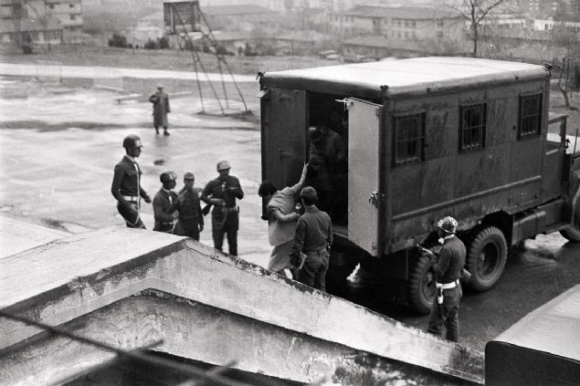 Milliyetçi Selamet Partisi (MSP) Genel Başkanı Necmettin Erbakan (sol önde) Tahir Büyükkorukçu (sakallı) ve Şener Battal (sağda) tutuklandı.