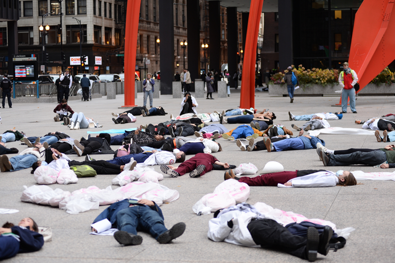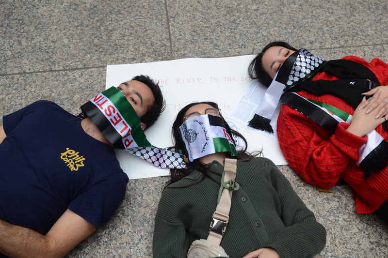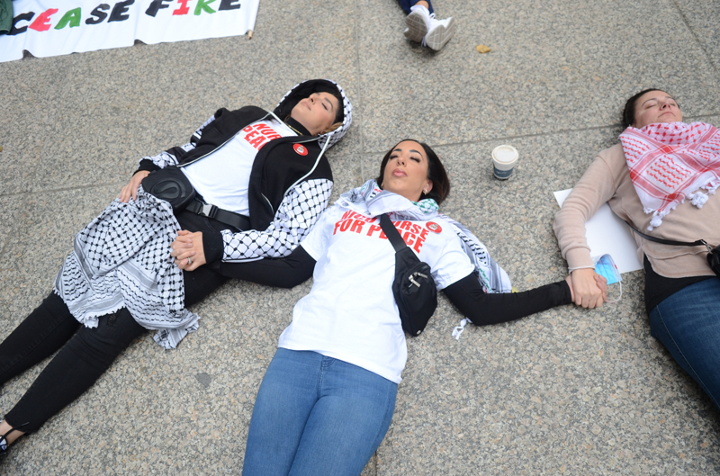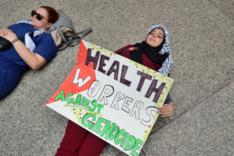 İşgalci İsrail'in katliamlarına dur diyen sağlık çalışanları, 'ölmeye yatarak' tepkilerini gösterdi.