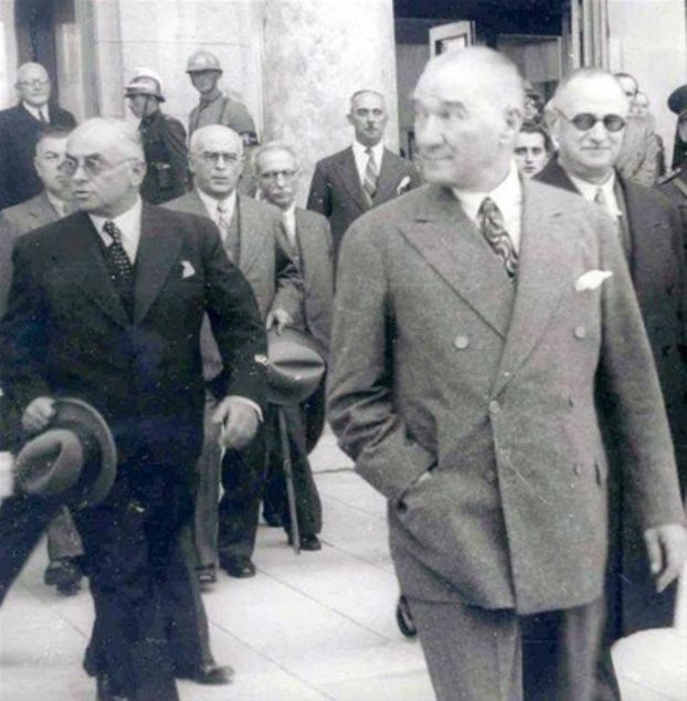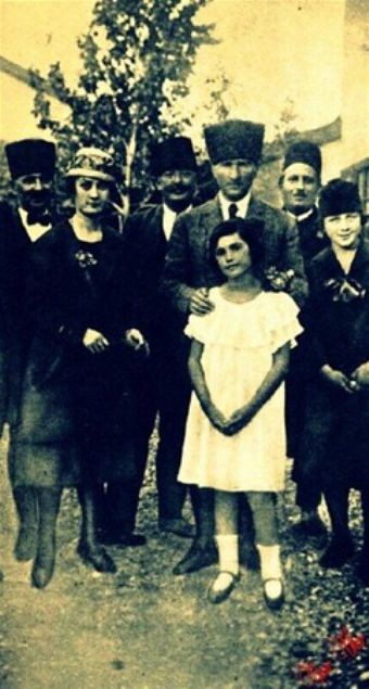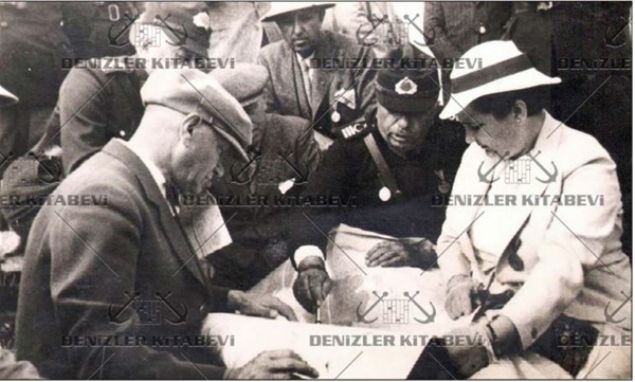 Atatürk, Yalova'daki Yürüyen Köşk'te... Yanında manevi kızı Rukiye ve yakın arkadaşları Kılıç Ali, Fethi Okyar ve yaveri Salih Bozok ile birlikte...