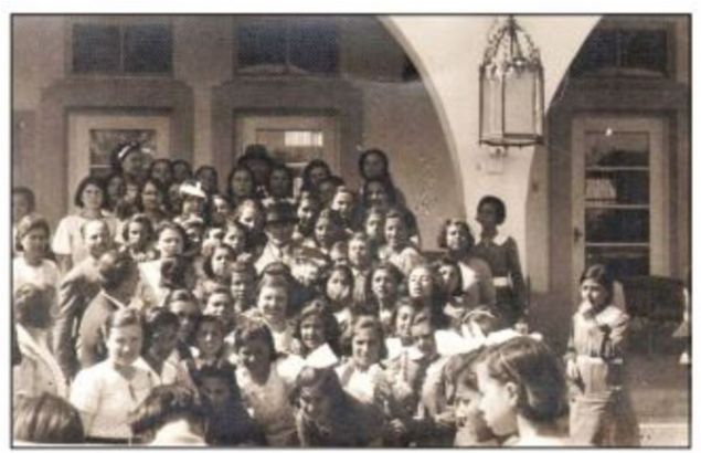 Atatürk, Ankara'da Orman Çiftliği içindeki Marmara Köşkü önünde kız öğrenciler arasında...