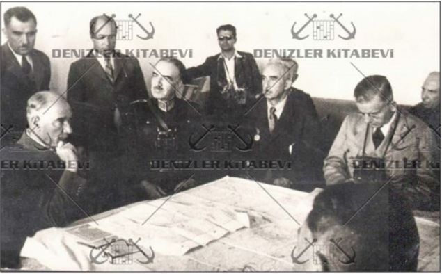Atatürk, Fevzi Paşa ve İsmet İnönü harita başında bir operasyon veya tatbikata dair bilgiler alırken...