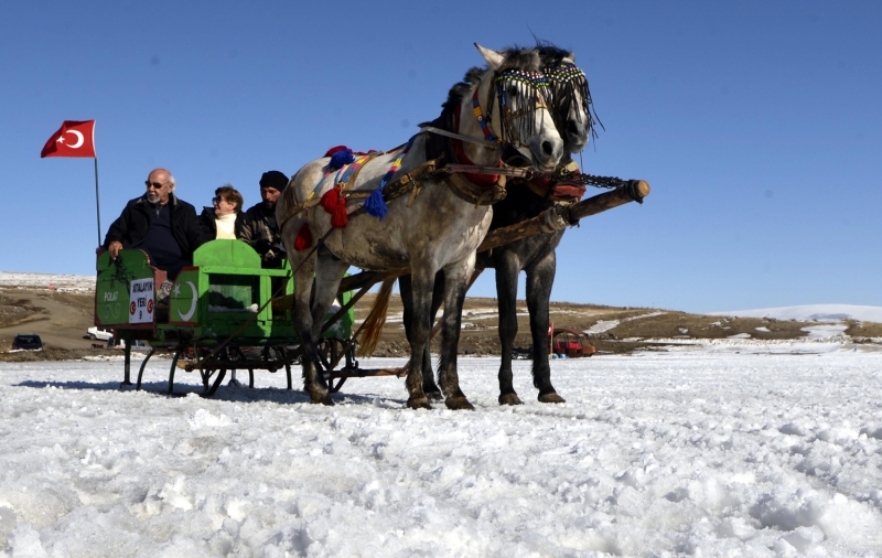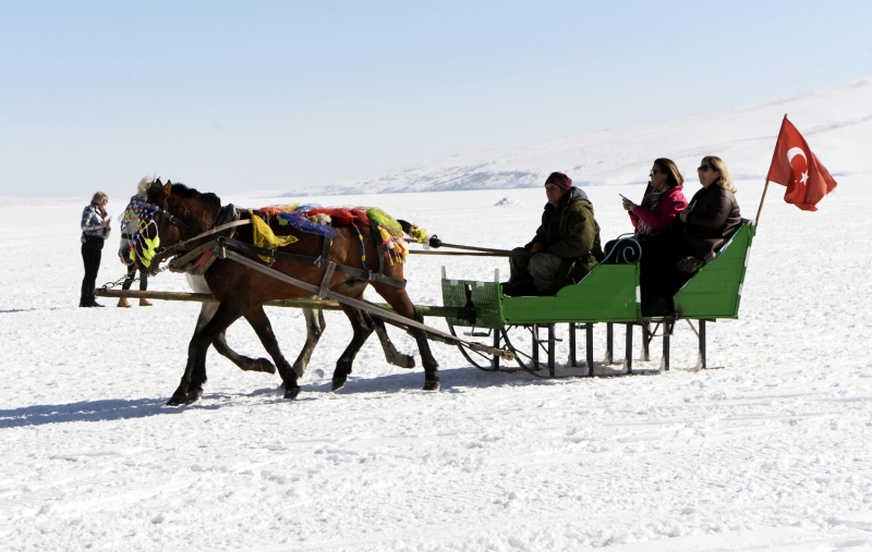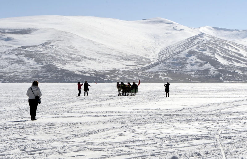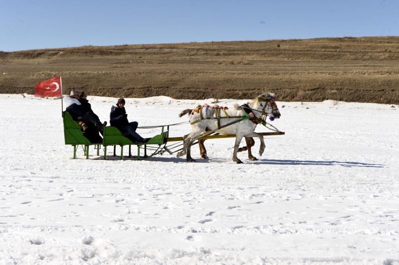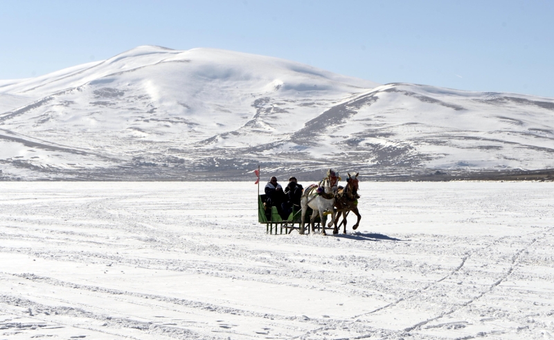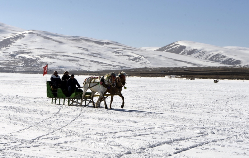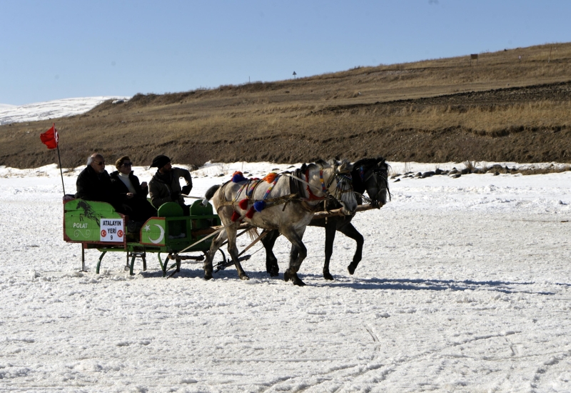 Kışın kar yağışı ve dondurucu soğukların etkisiyle yüzeyinin tamamı buzla kaplanan Çıldır Gölü'nde atlı kızakla gezinti keyfinin mart sonuna kadar sürmesi bekleniyor.