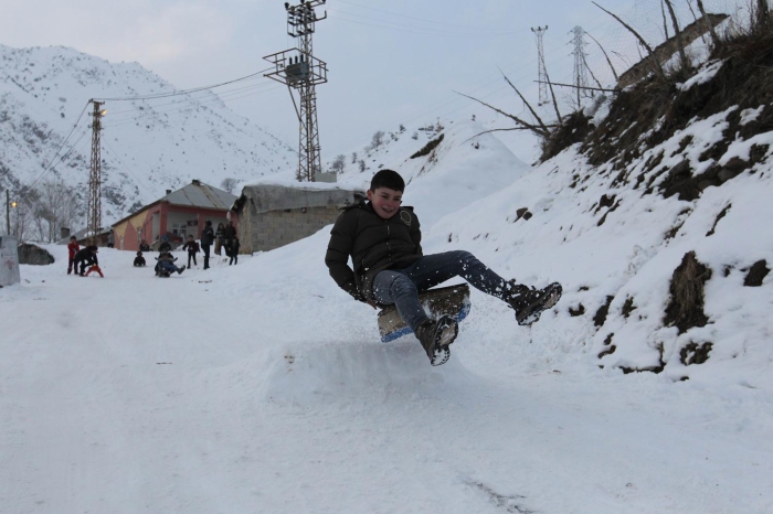 Hakkari'ye 15 kilometre mesafedeki Çanaklı köyünde tatili fırsat bilen çocuklar, büyüklerinin yaptığı kızakları alarak yüksek tepelere ve buzlanan yollara akın etti.