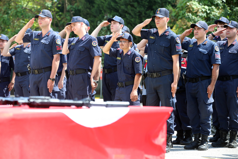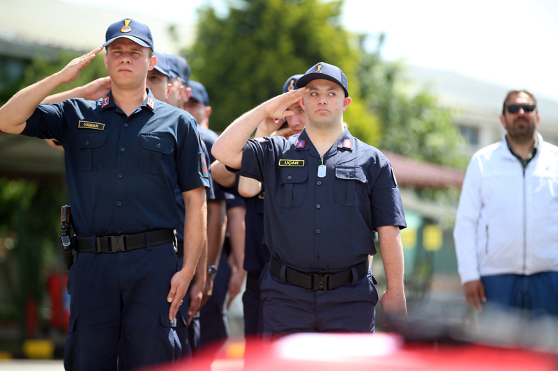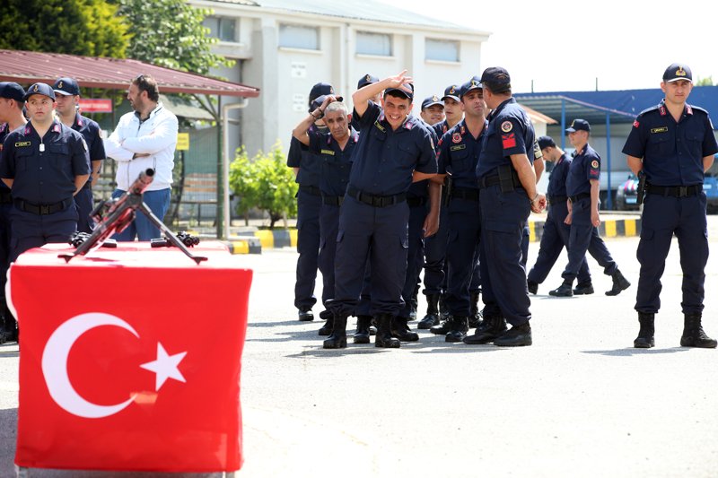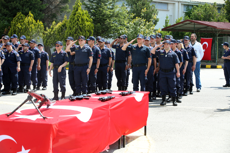 Jandarma üniforması giyen gençler, saygı duruşunda bulunulması ve İstiklal Marşı'nın okunmasının ardından ellerini Türk bayrağı ve silahların üzerine koyup ant içti.