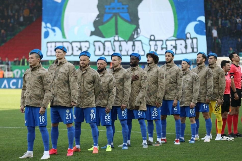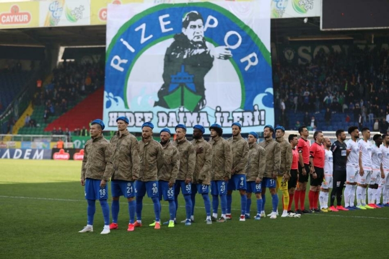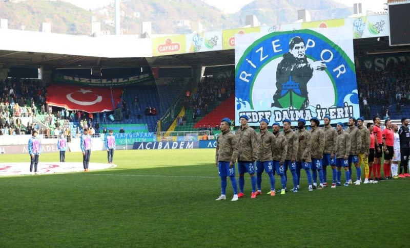Süper Lig'in 25. haftasında Aytemiz Alanyaspor'u konuk eden Çaykur Rizespor'un başkanı Hasan Kartal, teknik direktörü Ünal Karaman ve oyuncuları, Bahar Kalkanı harekatı şehitlerini anmak için seremonide askeri kıyafetlerle yer aldı.