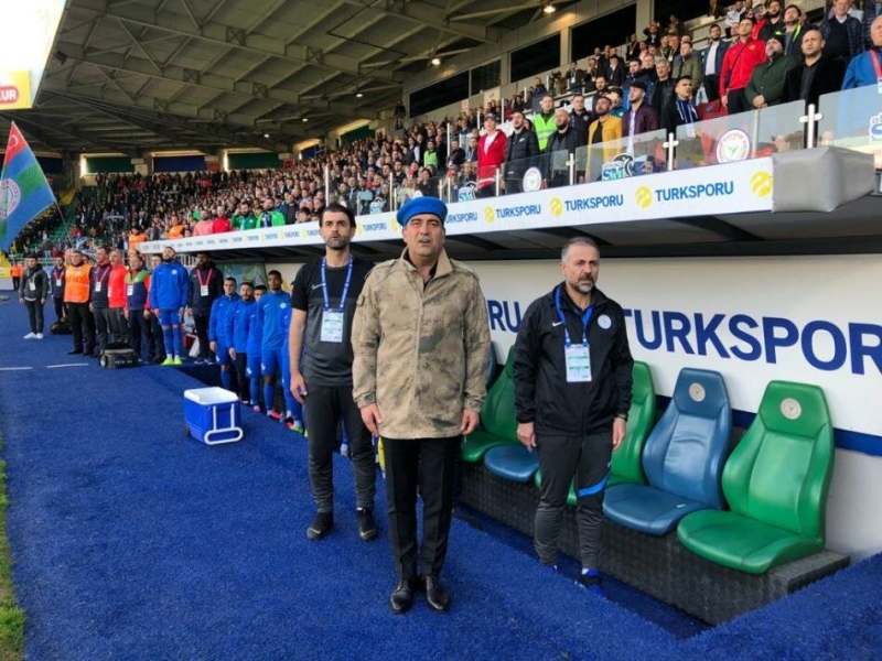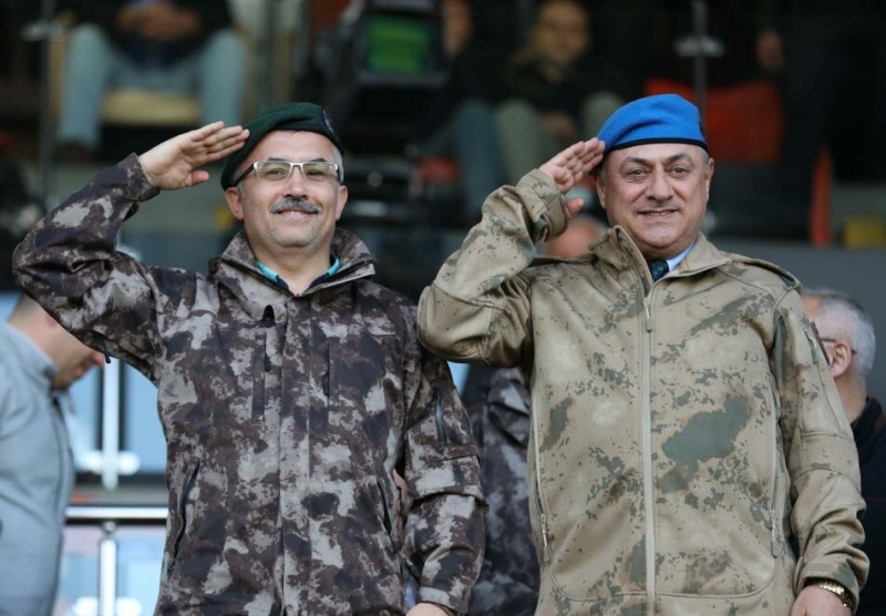 Teknik direktör Ünal Karaman'ın yedek kulübesinde, başkan Hasan Kartal'ın ise protokol tribününde asker parkası ve kepiyle yer aldığı görüldü.