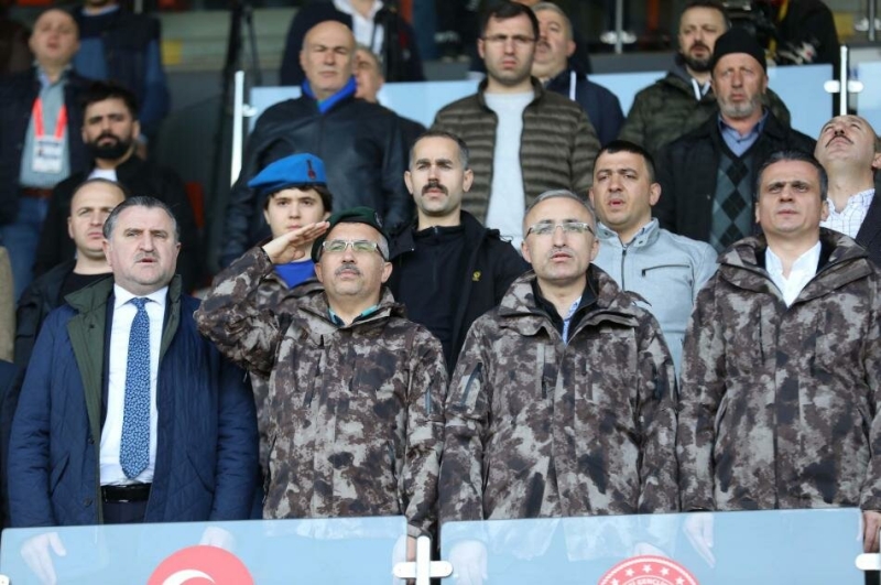Çaykur Didi Stadı'ndaki müsabaka öncesi gerçekleştirilen seremoniye ev sahibi ekip oyuncuları, kafalarında jandarma komando kepiyle ve kollarında uzman çavuş rütbe armaları yer alan parkalar giymiş olarak çıkarken, İstiklal Marşı'nı da Türk bayrağına dönerek okudu.