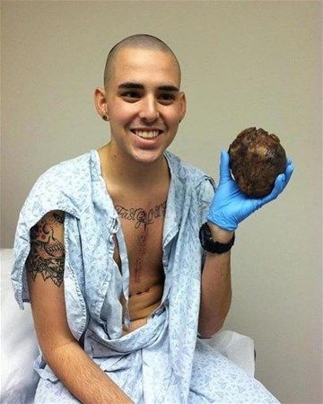 Başarılı bir kalp nakli ameliyatı geçiren hasta, eski kalbini elinde tutuyor.