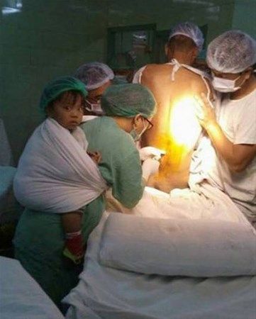 Çocugunu sırtına bağlayarak ameliyata giren doktor.