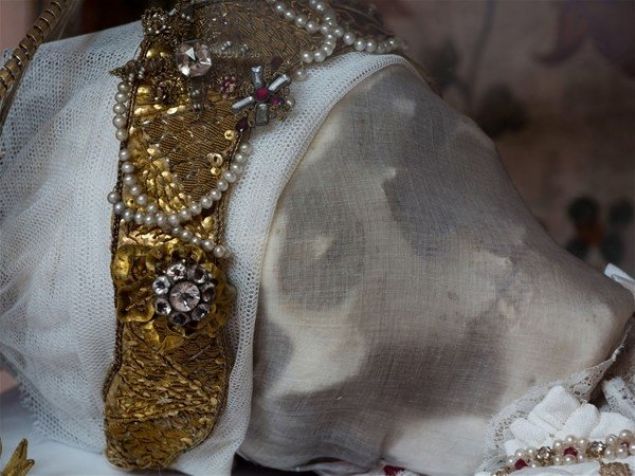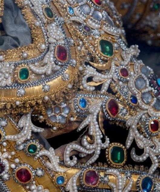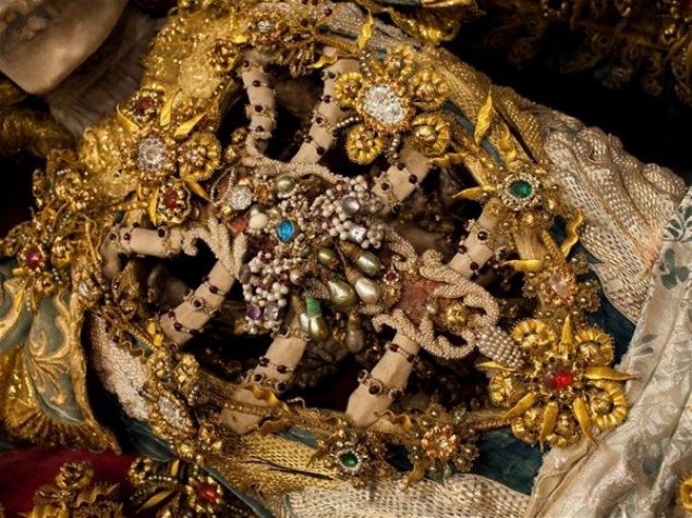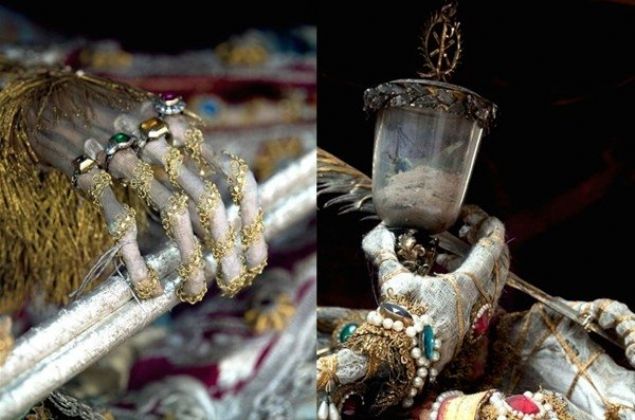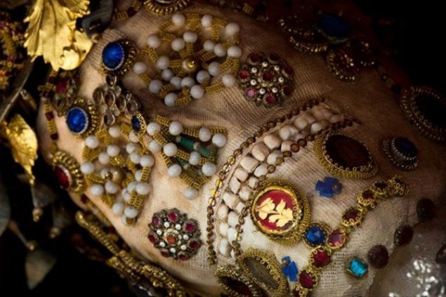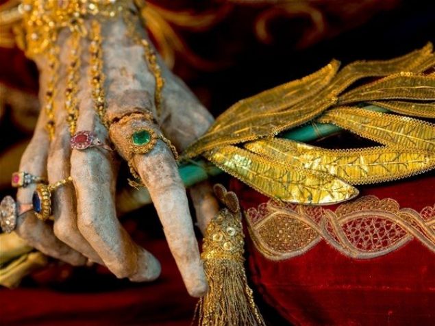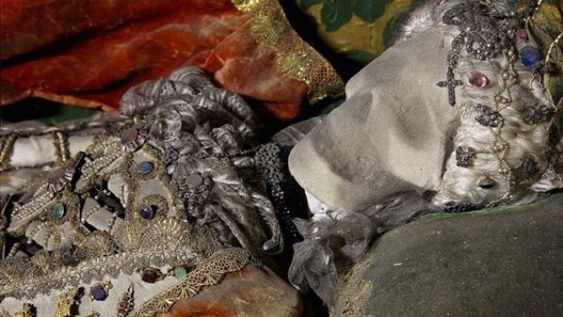 Her iskelet giydirilmiş ve pahalı kıyafetler, taçlar, silahlar ve hatta peruk gibi çeşitli çok değerli objeler ve taşlarla süslenmiş durumda bulunuyor.