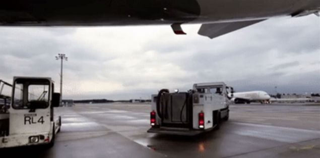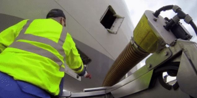Uçak piste indiğinde küçük bir araba uçağın alt bölmesine yaklaşarak, hortum yardımıyla tüm atıkları tahliye ediyor.