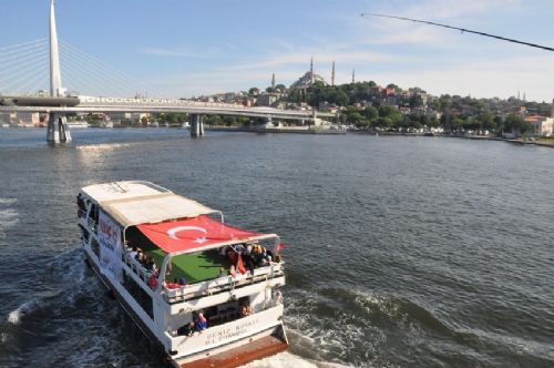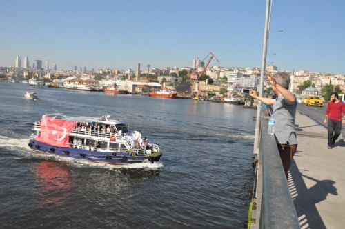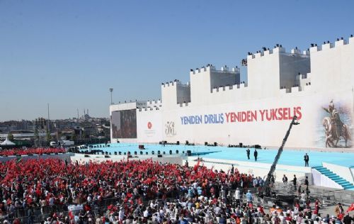 İstanbul Yenikapı Miting Alanı'ndaki Fetih şölenine Cumhurbaşkanı Erdoğan'ın gelişi sırasında açılan pankart büyük alkış aldı.