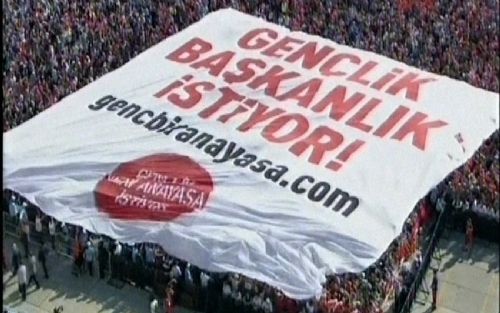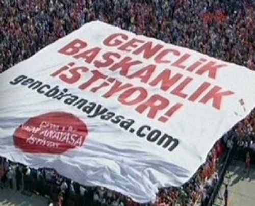 Erdoğan'ın helikopteri alan üzerinden geçerken 'Gençlik Başkanlık İstiyor' yazılı dev bir pankart açıldı.