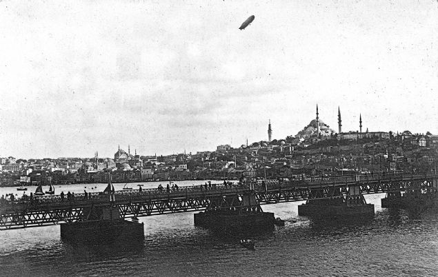 Meşrutiyet Bayramı kutlamaları. Haliç'teki Unkapanı Köprüsü üzerinde zeplin. 1916