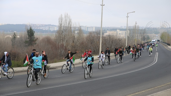 DÜ İktisadi ve İdari Bilimler Fakültesi önüne bisikletleri ve ellerinde Filistin bayrakları ile gelen katılımcılar merkez Sur ilçesindeki Ulucami önüne kadar pedal çevirdi.