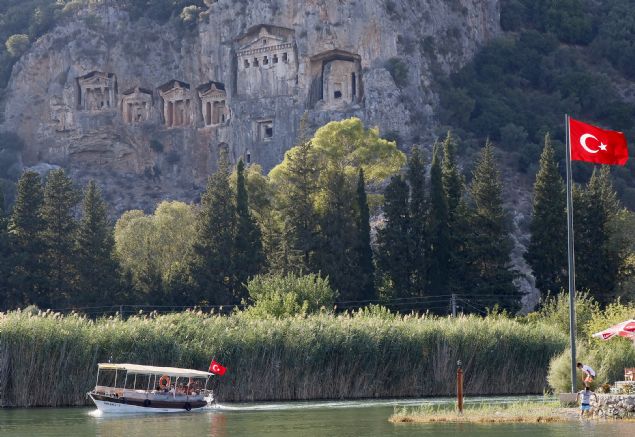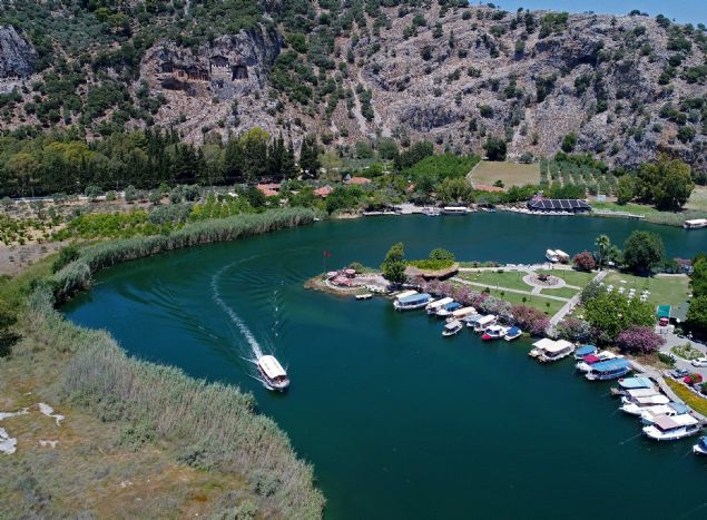 Dalyan'dan hareket eden tekneler Kaunos'taki kaya mezarlarının önünden yolcularını adeta zamanda yolculuğa çıkarmış oluyor.