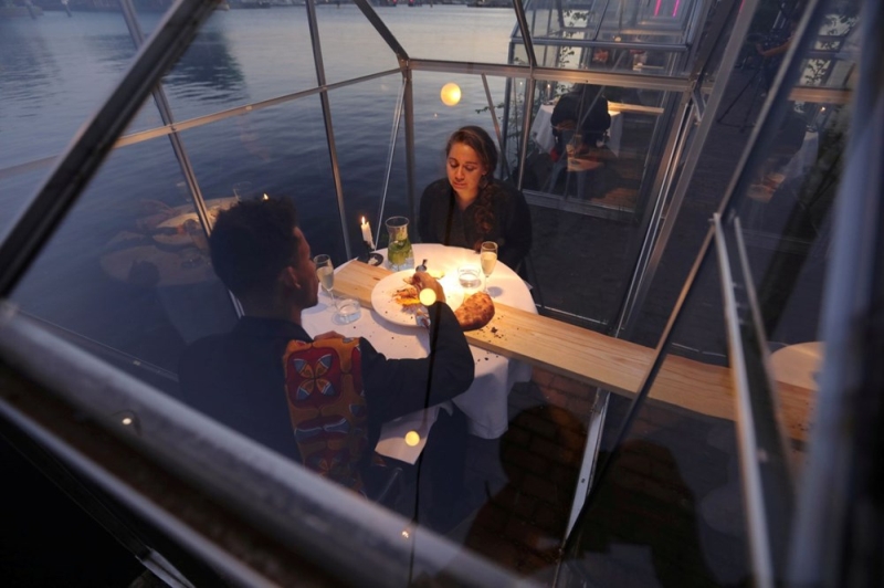 Restoran, kapının önüne kaldırımlara iki kişilik camdan kabinler kurdu. Cam kabinlerde tek bir masa ve iki sandalye bulunuyor. (NTV)