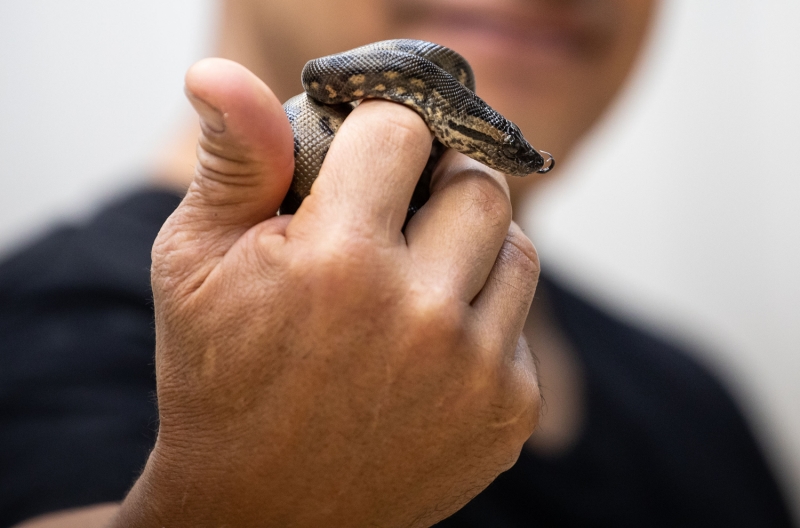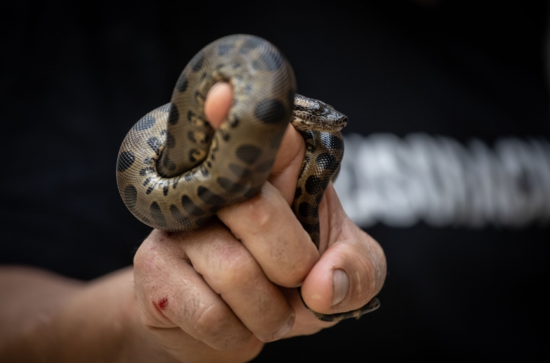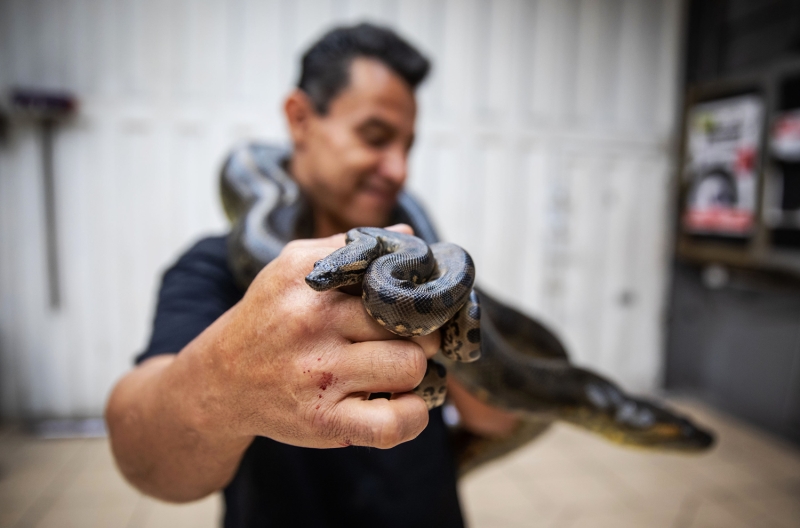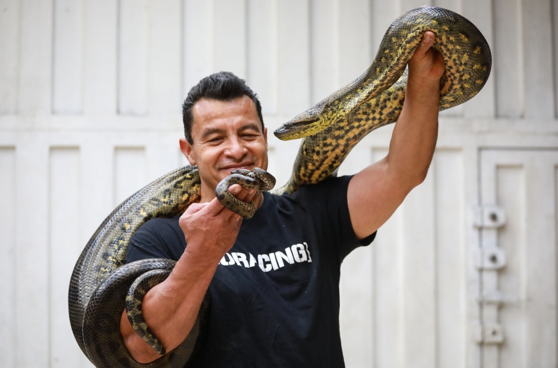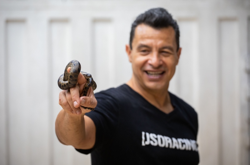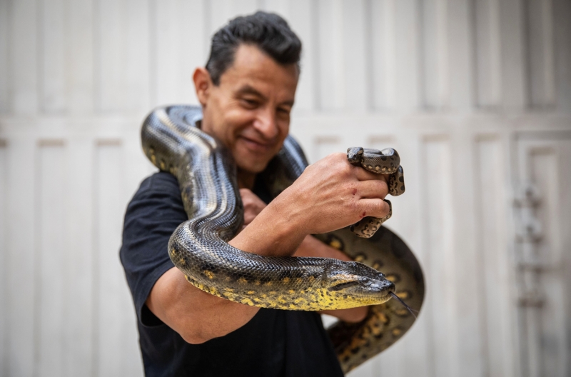 Özel sürüngen koleksiyonun bir parçası yeşil anakondalar olan Jamie Sanchez, 7 yaşındaki anakonda ve bir aylık yavrularıyla birlikte poz verdi.