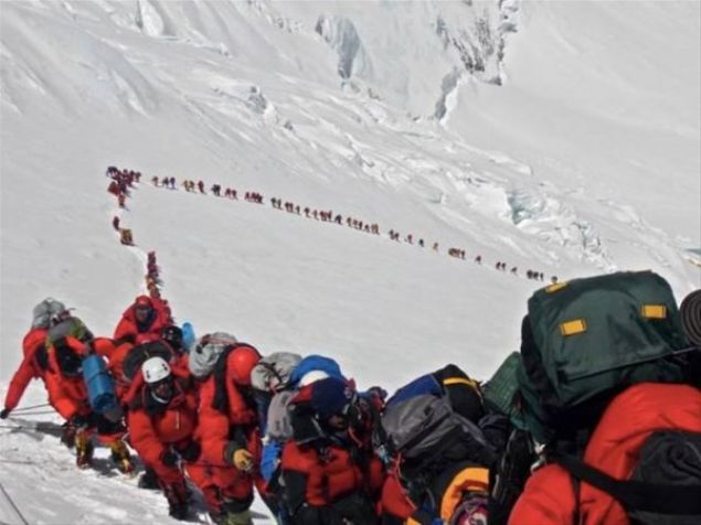 Dünyanın zirvesinde insan trafiği sorunuDağa tırmananlar yolun daraldığı yerlerde insan kalabalığından ötürü devam edebilmek için iki buçuk saate yakın sıra beklemelerinden yakınıyor