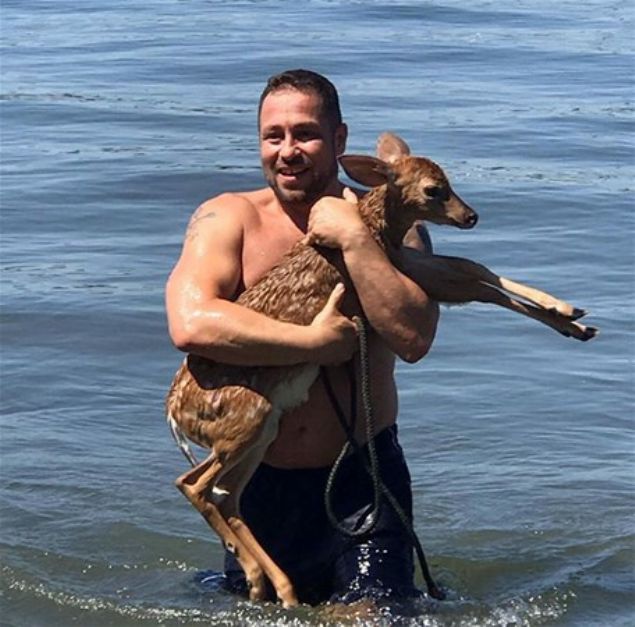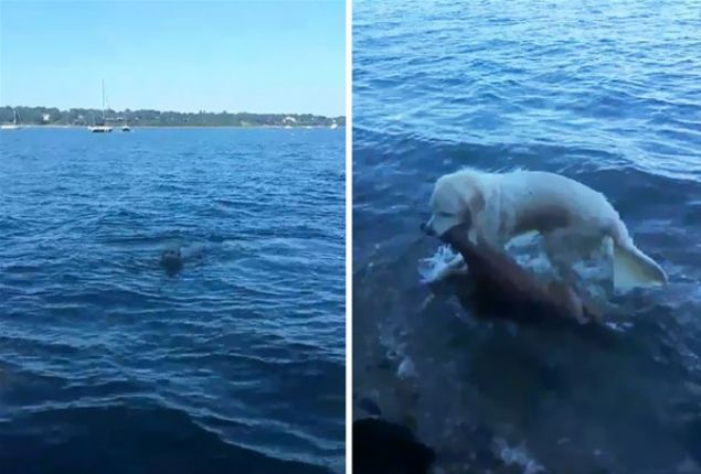 Ağzıyla denizden sürükleyerek çıkardığı yavru geyiği ardından yalayarak sıcak tutmaya ve onu rahatlatmaya çalışıyor. Ama geyik yeniden kaçıp suya atlıyor. Bu sefer de sahibi geyiği kurtarmak için suya giriyor ve geyik bir kez daha kurtarılıyor.