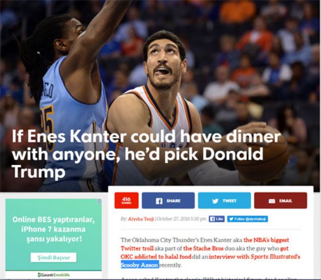 Enes Kanter'in Trump'la ilgili sözleri USA Today adlı internet sitesinde yer aldı. Ayrıca bu yazıda Kanter'in NBA'in en büyük trolü olduğu ifade edildi.