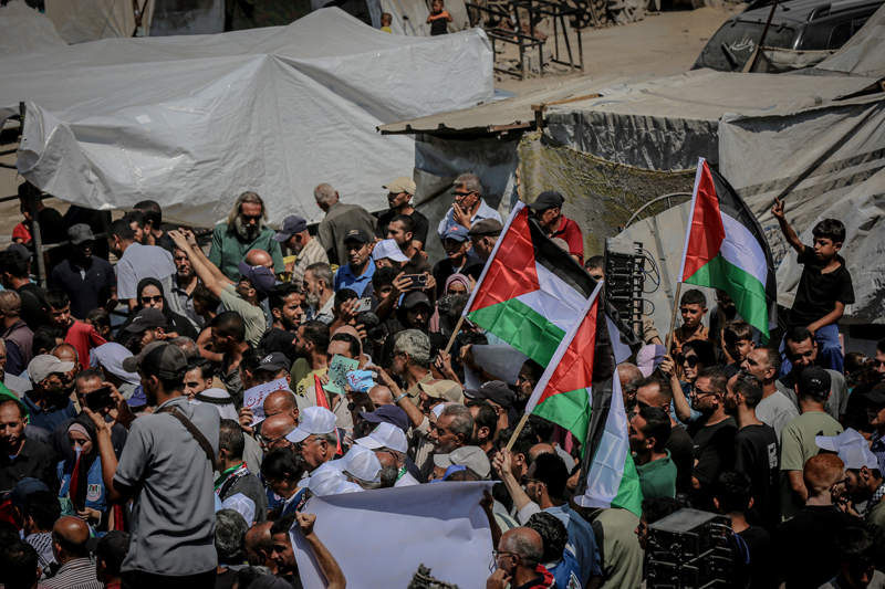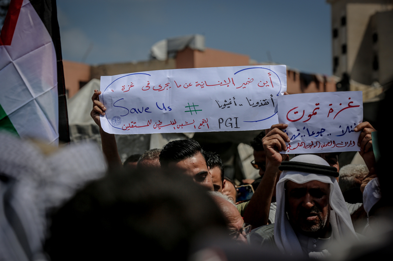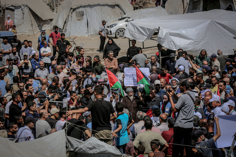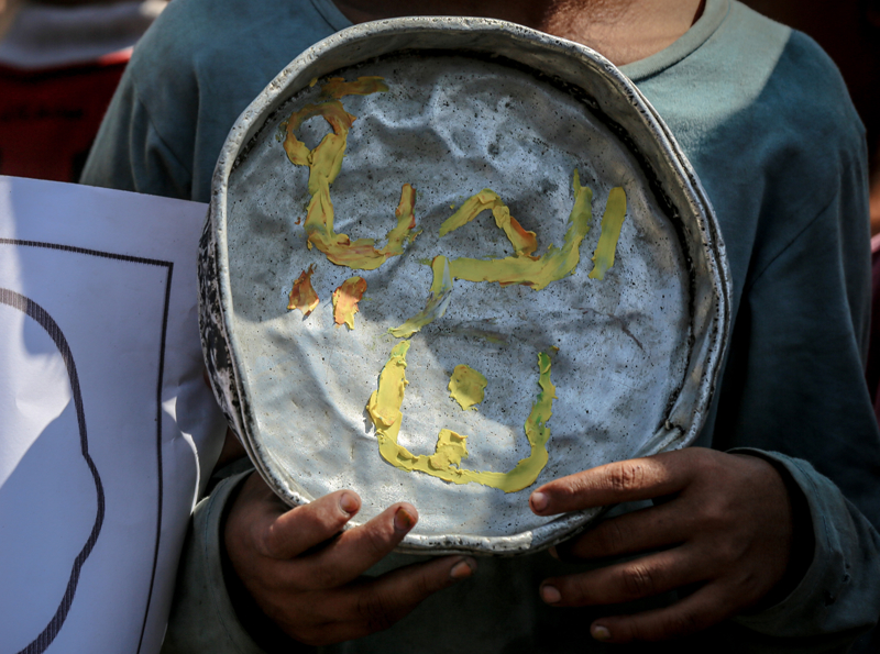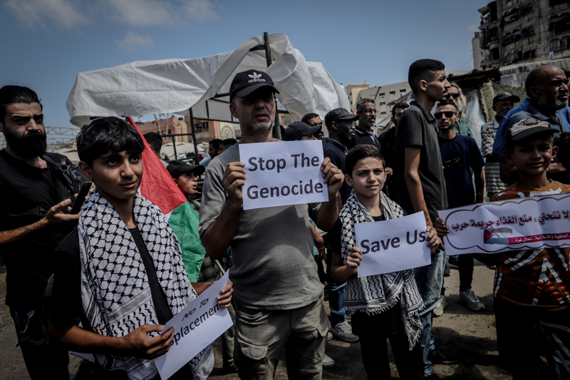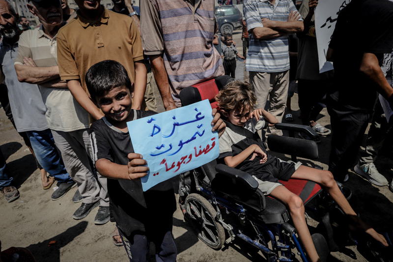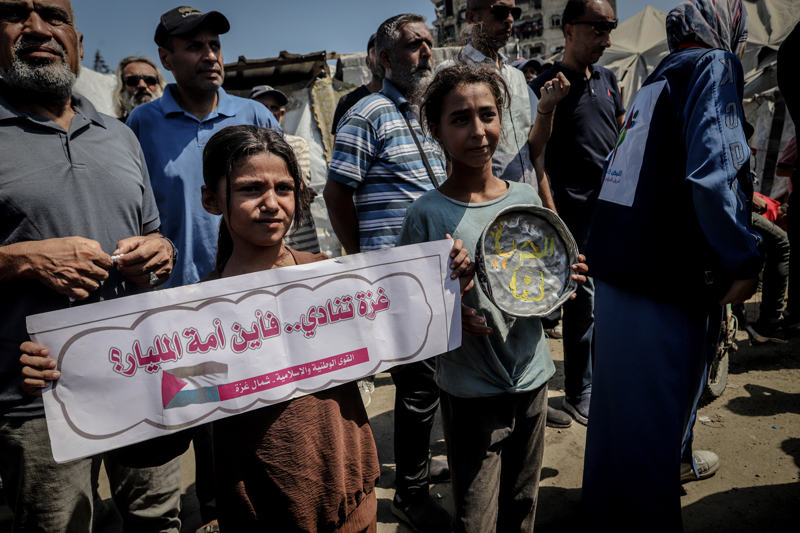 Gazze'nin er-Rimal Mahallesi'nde toplanan çok sayıda Filistinli, İsrail saldırılarının son bulması ve zorunlu göçün önlenmesi talebiyle gösteri düzenledi. Gıda kıtlığına dikkat çeken göstericiler, ellerinde 'Saldırıları durdurun, bizi kurtarın' yazılı dövizler ve Filistin bayrakları taşıdı.