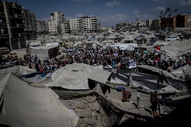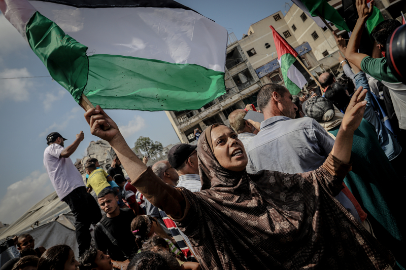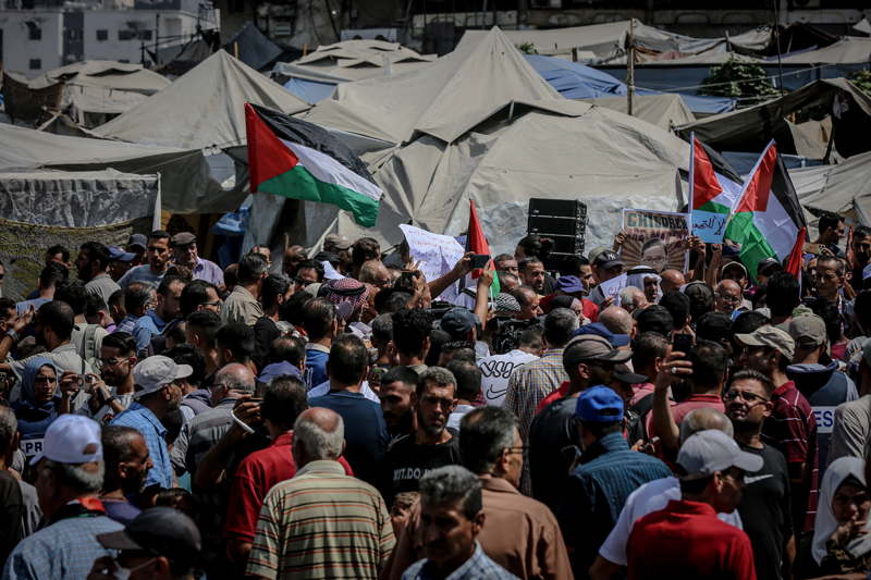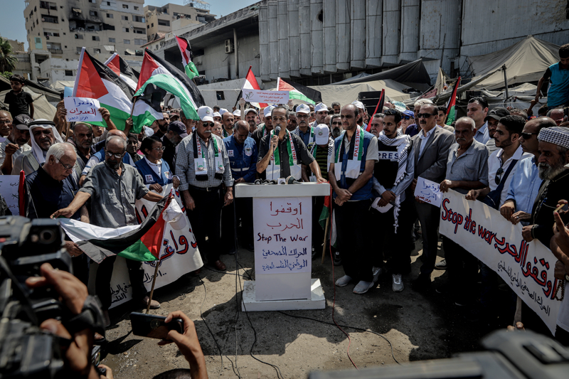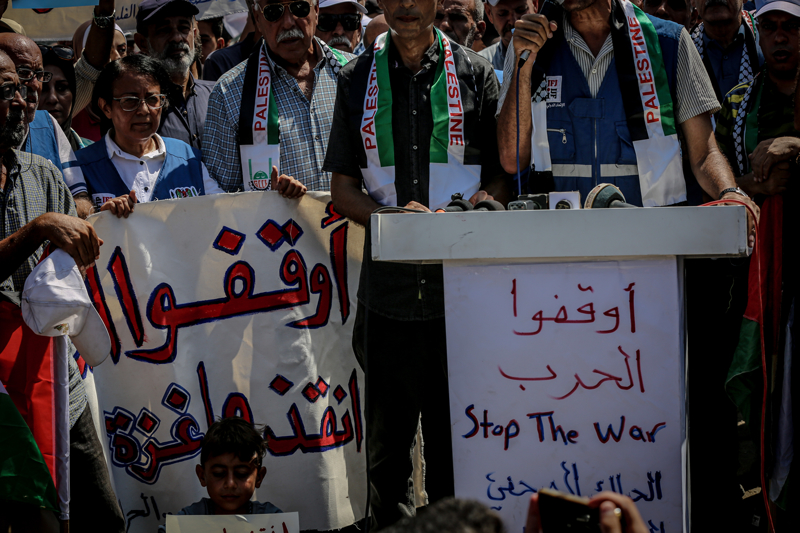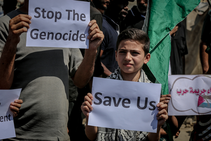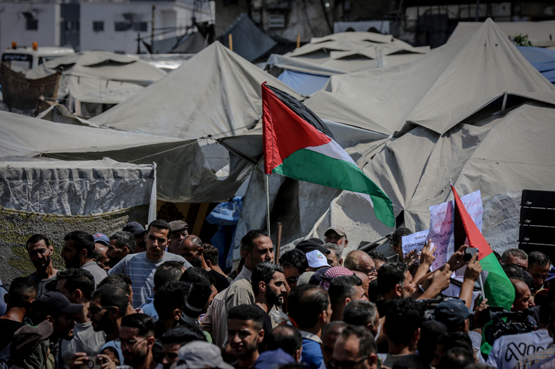 Gazze'nin er-Rimal Mahallesi'nde toplanan çok sayıda Filistinli, İsrail saldırılarının son bulması ve zorunlu göçün önlenmesi talebiyle gösteri düzenledi. Gıda kıtlığına dikkat çeken göstericiler, ellerinde 'Saldırıları durdurun, bizi kurtarın' yazılı dövizler ve Filistin bayrakları taşıdı.