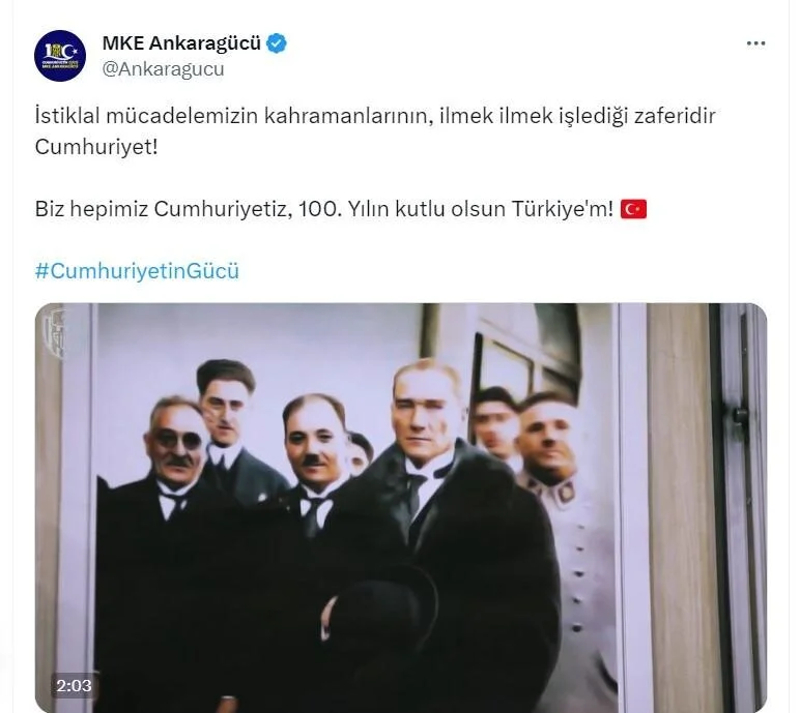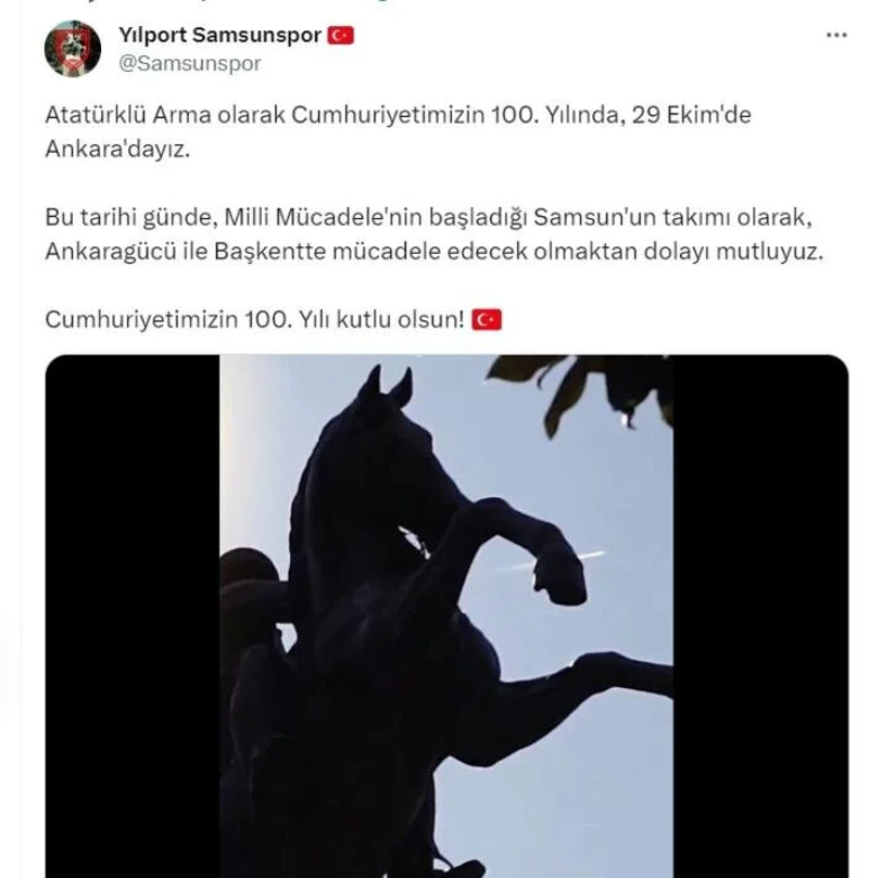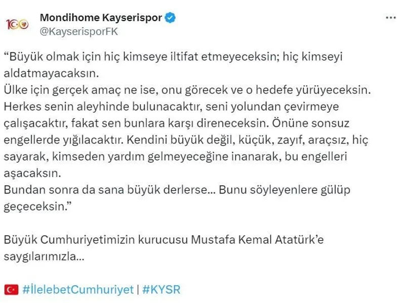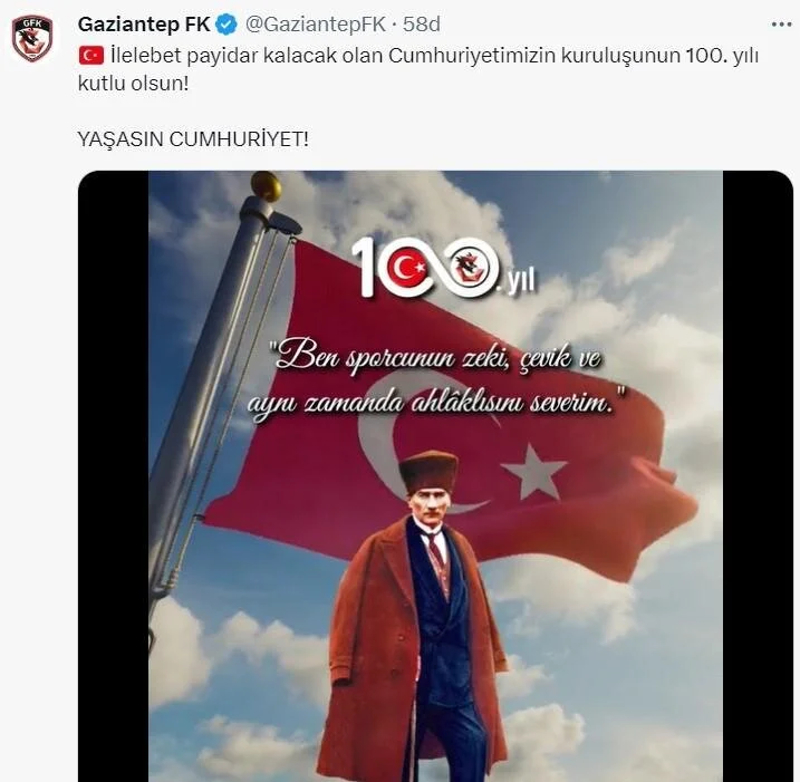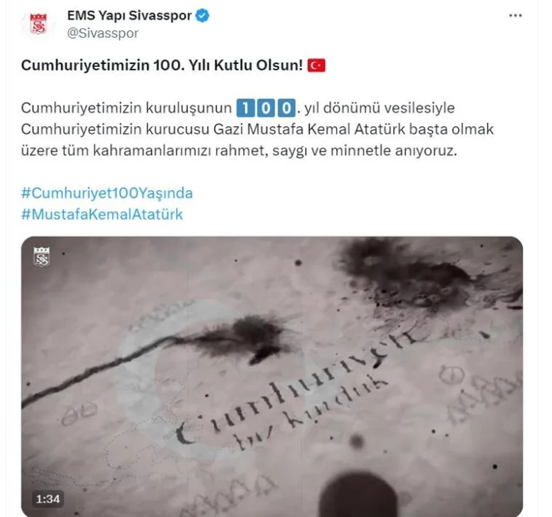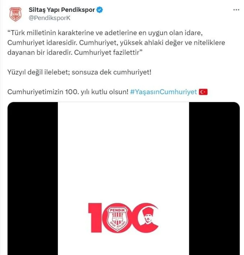 Cumhuriyet'in 100. yıl coşkusu tüm Türkiye'de yaşanmaya devam ediyor. Bu anlamlı günü futbol kulüplerimiz de sosyal medya hesapları üzerinden yaptıkları paylaşımlarla kutladı. İşte o paylaşımlar...