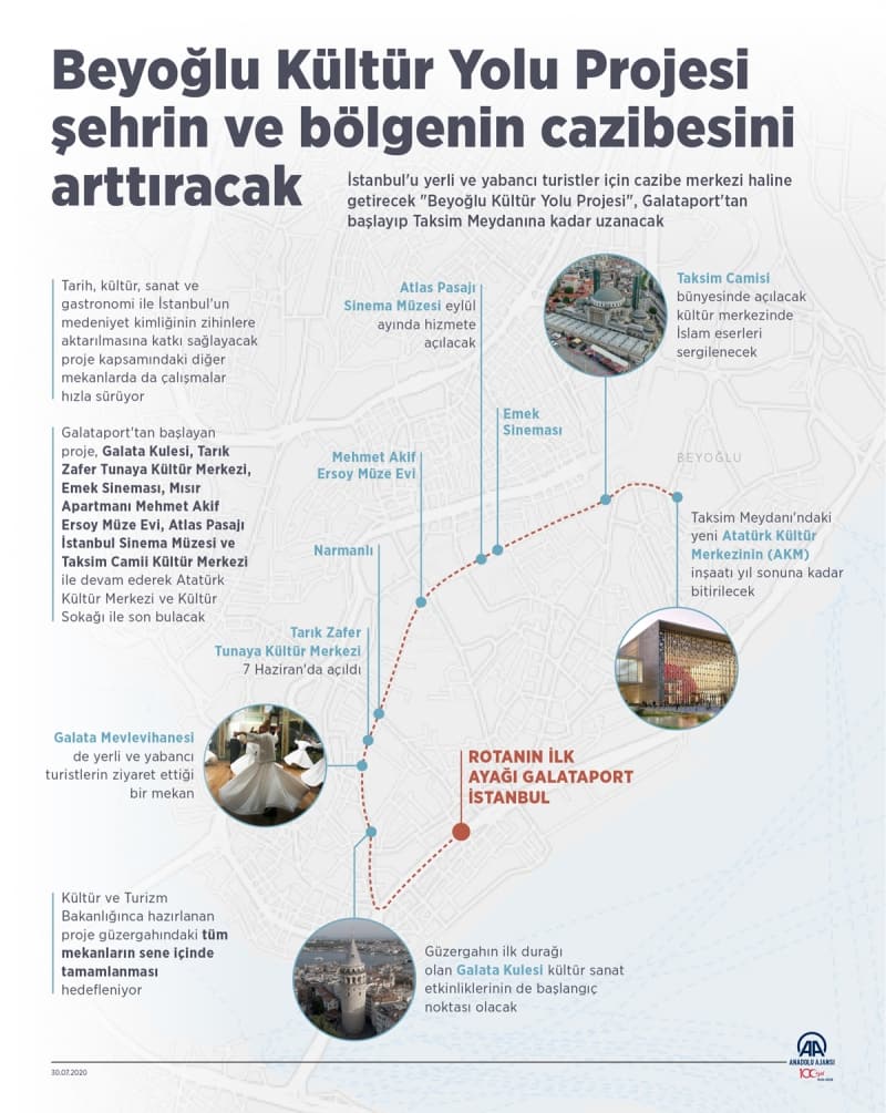 Kültür ve Turizm Bakanlığınca hazırlanan İstanbul ile Türkiye'nin kültür sanat etkinliklerine ev sahipliği yapması hedeflenen turistik rota Beyoğlu Kültür Yolu Projesi , Galataport'tan başlayıp Taksim Meydanına kadar uzanıyor. çalışmalar hız kesmeden devam ediyor.