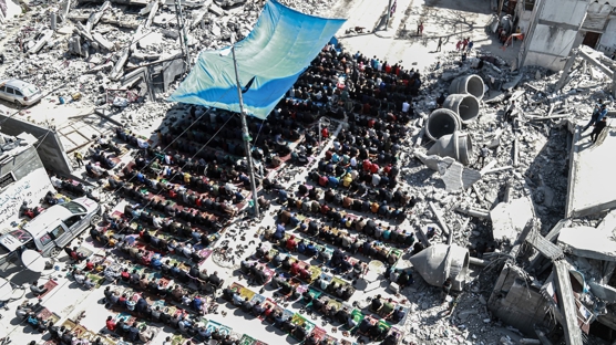 Gazze'nin Refah kentindeki Filistinliler, Ramazan ayı öncesindeki son cuma namazını İsrail saldırısında yıkılan Faruk Camii enkazında kıldı.
