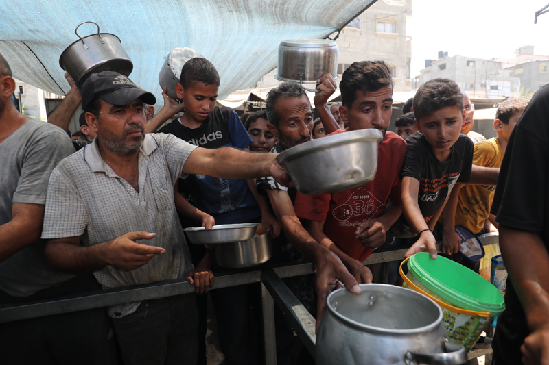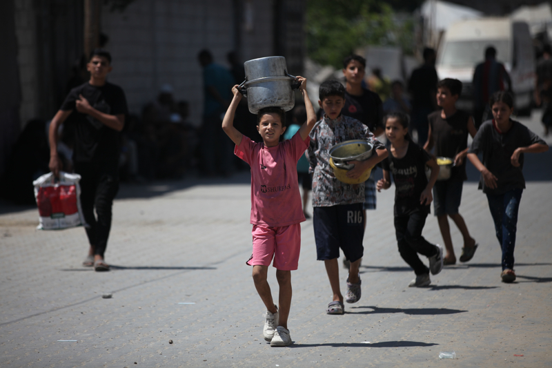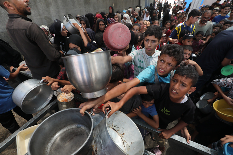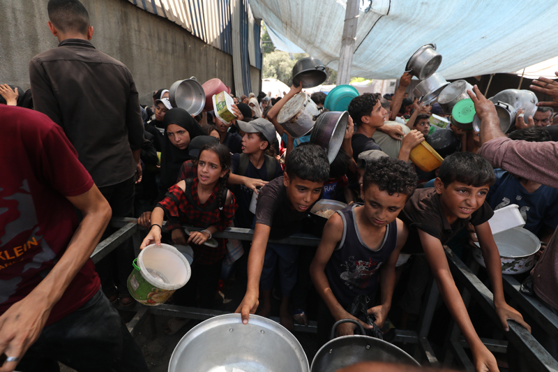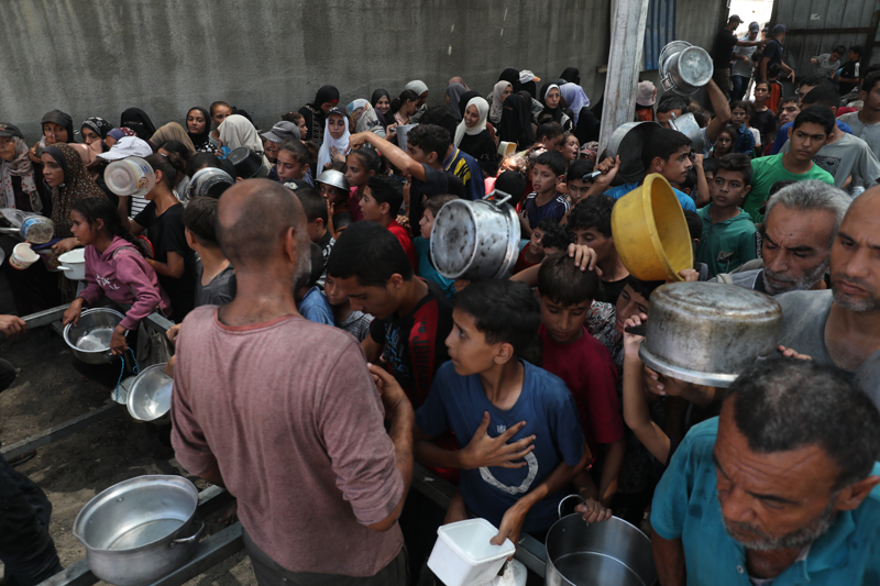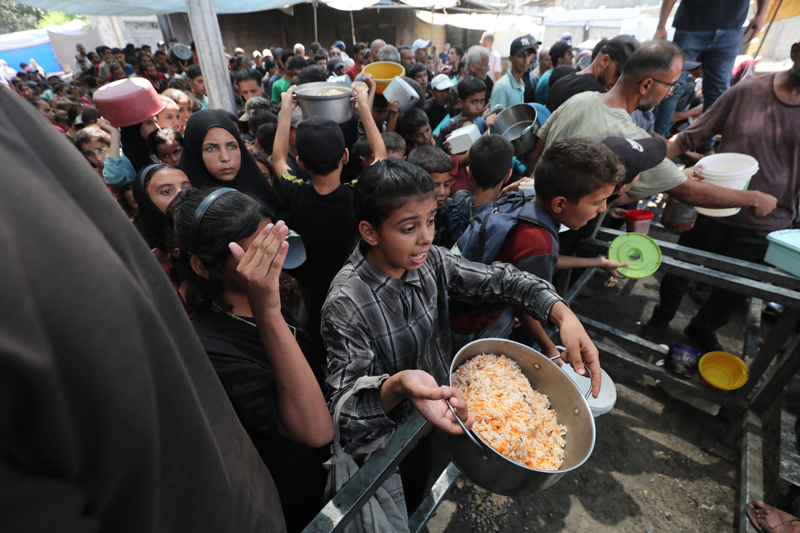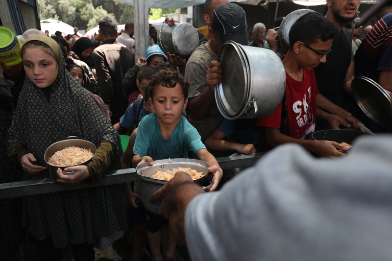 İsrail'in Gazze Şeridi'ne yönelik ablukası ve derinleşen açlık krizi nedeniyle gıdaya erişimde zorluk yaşayan Filistinlilere, Gazze Şeridi'nin orta kesiminde yer alan Nuseyrat Mülteci Kampı'nda sıcak yemek dağıtımı yapıldı.