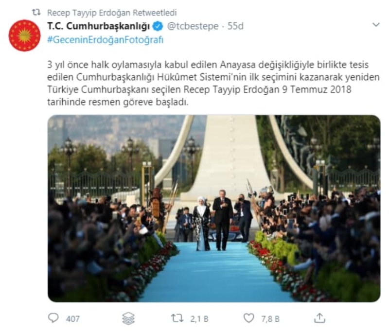 Resmi hesaptan yapılan paylaşımda '3 yıl önce halk oylamasıyla kabul edilen Anayasa değişikliğiyle birlikte tesis edilen Cumhurbaşkanlığı Hükûmet Sistemi'nin ilk seçimini kazanarak yeniden Türkiye Cumhurbaşkanı seçilen Recep Tayyip Erdoğan 9 Temmuz 2018 tarihinde resmen göreve başladı.' ifadelerine yer verildi.