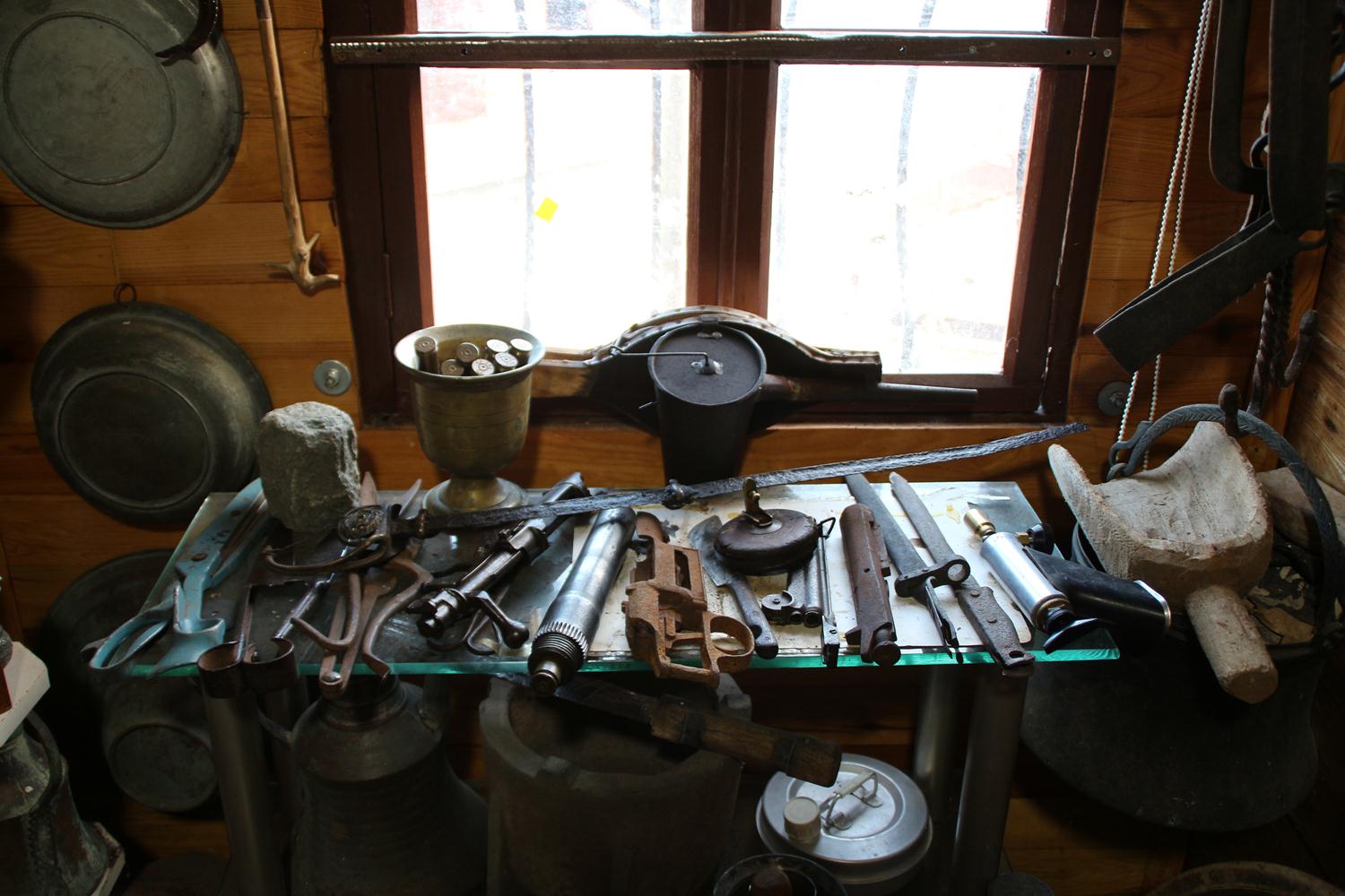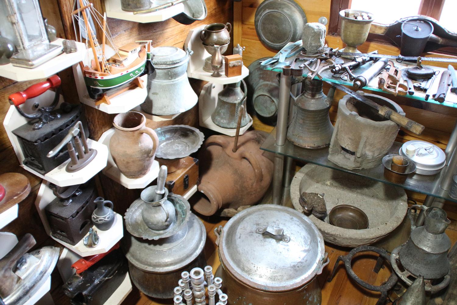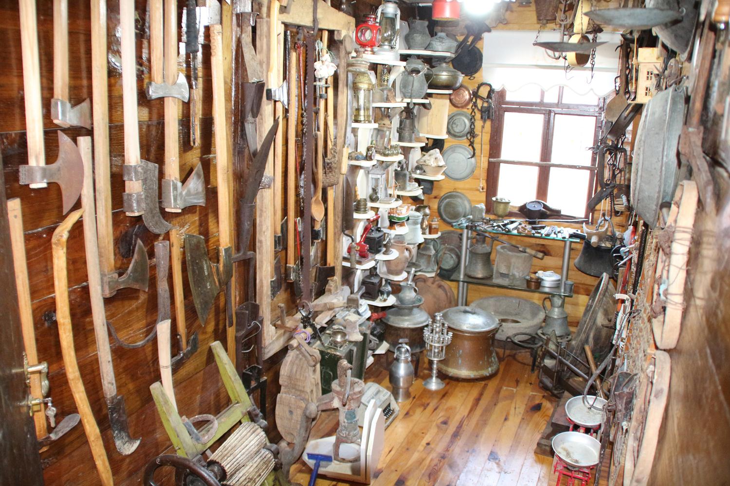 '15 YILDA 250’Yİ AŞKIN ÜRÜN TOPLADIK' 15 yıla yakın bir zamandır eşya topladığını anlatan Kuleci, "15 yıldır bu iş üzerine odaklandım, ürünler topluyorum. Saymadım ne kadar parça var ama 250 üzerinde olduğunu düşünüyorum. Buradaki en eski ürün dedeme ait olan bir hızar. Yaklaşık 140 yıllık bu hızarla zamanında bu ev yapılmış.